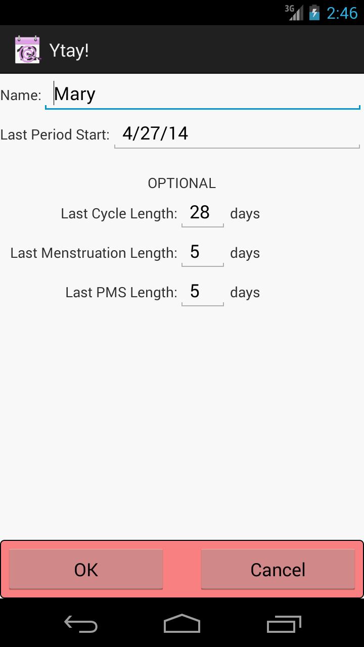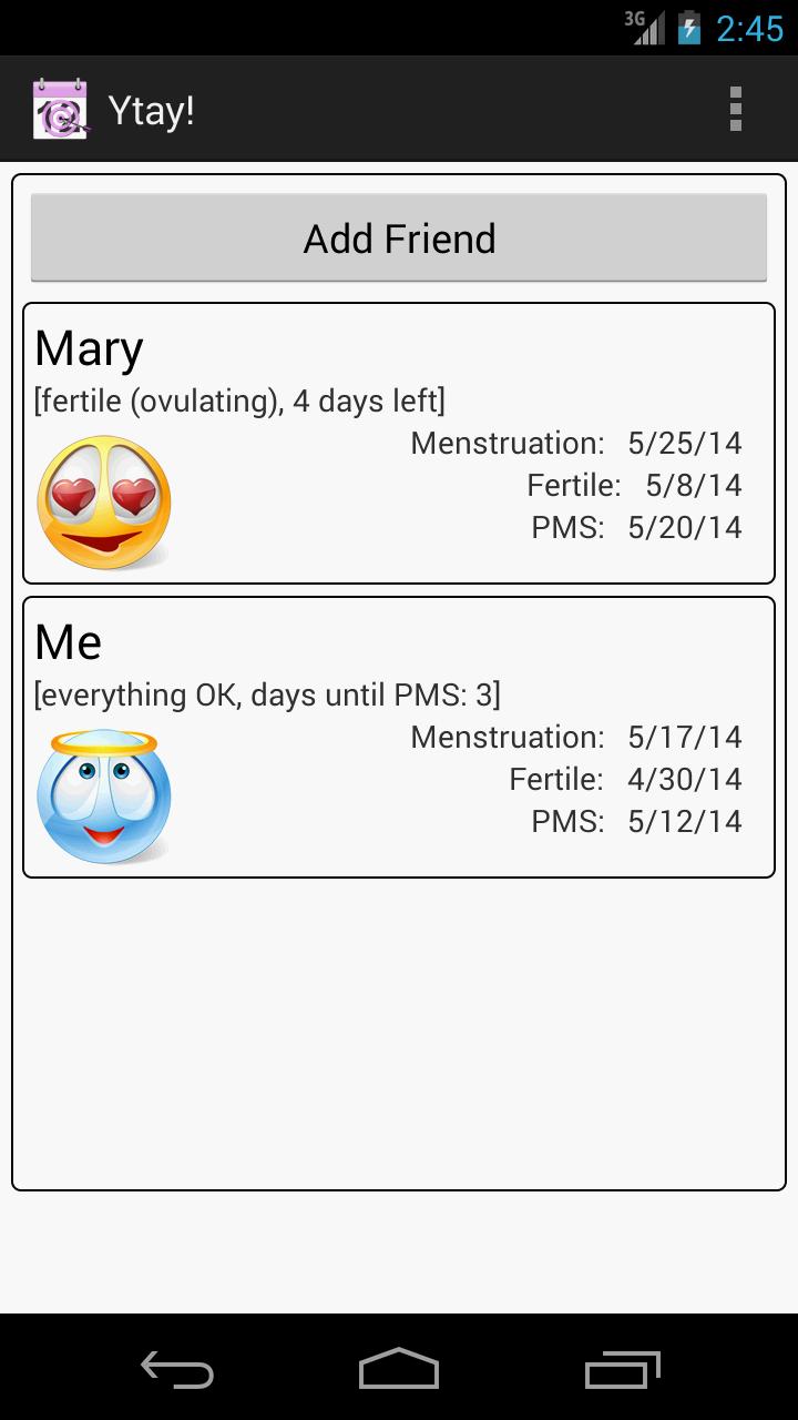 Ytay! ist wirklich einfach. Keine umständlichen Kalender, schwer zu lesen. Tippen Sie einfach auf die Schaltfläche "Freund hinzufügen", um Freunde und Verwandte hinzuzufügen (oder sogar sich selbst, wenn Sie Ihre Periode auf eine einfache Weise kontrollieren möchten) und das Datum der letzten Zeit einfügen und, wenn Sie genauer sein möchten, die übliche Länge des Zyklus. Mit diesen Daten ytay! Wird anfangen zu arbeiten und zu warnen. Und wenn sich die Periodenlänge ändert, gibt es kein Problem, ytay! Sie können die Zeitdaten einfach ändern. Sie tippen nur lange auf den Freund, den Sie ändern möchten, und fügen Sie die neuen Daten ein.