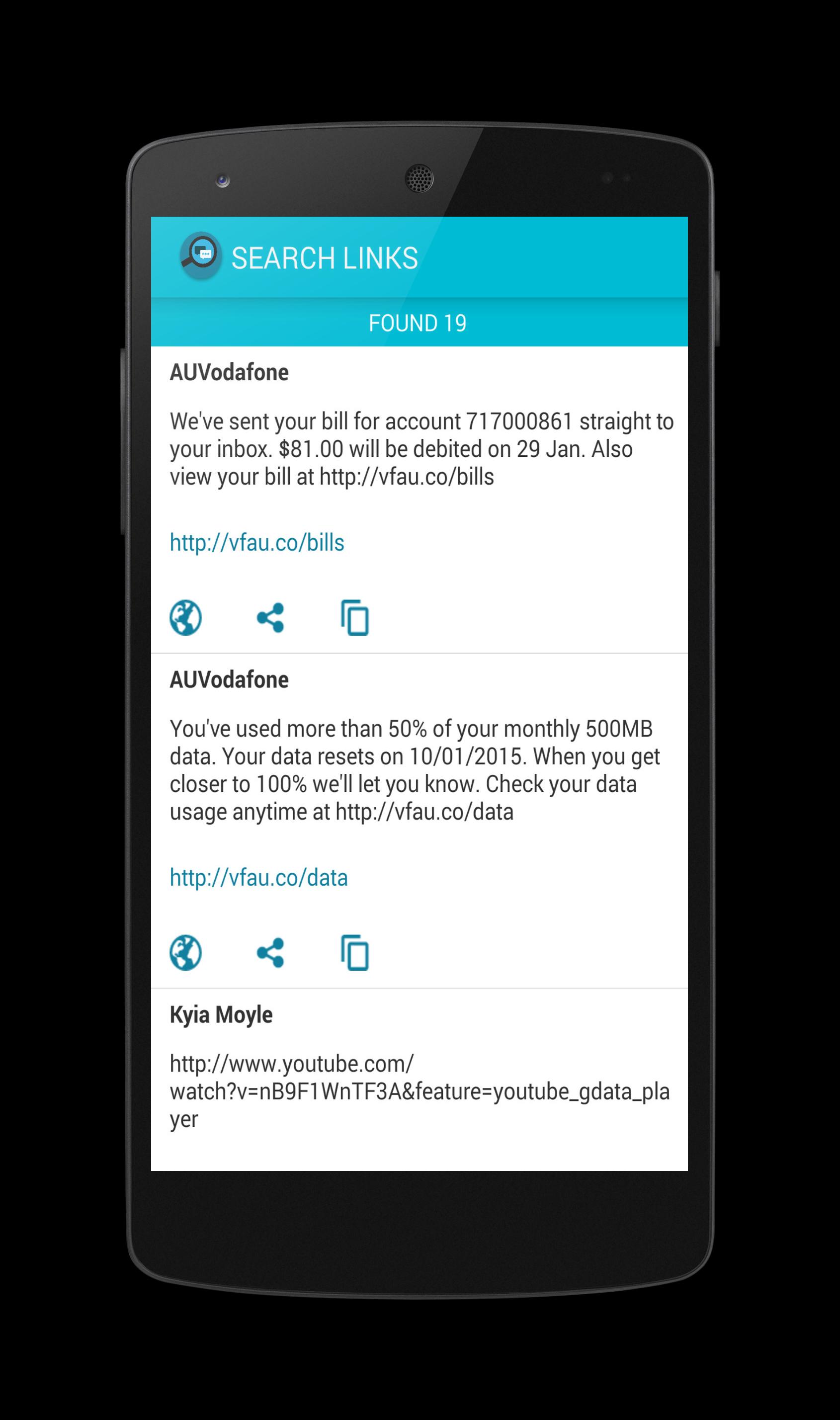 Suchen Sie Ihren SMS -Posteingang nach Keyword nach Nachrichten. Suchen Sie Ihre Nachrichten nach Bildern und Links. Teilen Sie sie, sehen Sie sich an und retten Sie sie.