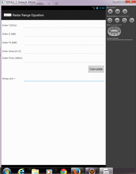 Diese App dient zum Erkennen eines maximalen Bereichs zum Erkennen eines Ziels unter Verwendung der Radar Range Equation für ein gepulstes Radar, wenn der Benutzer die Betriebsfrequenz des Radars in GHz, die Antennenverstärkung in DB, die Senderleistung in kW (Impulsleistung), die Zielquerschnittsfläche in M^2 und das minimale nachweisbare Signal pmin in DBM eingibt.
