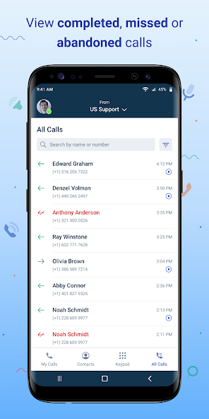 On-Call-Funktionen : Während des Anrufs können Sie stumm schalten, den Anruf an einen anderen Telefonbenutzer übertragen oder Ihren Anruf in die Warteschleife bringen, um ein sauberes Kundenerlebnis zu bieten. Sie können auch auf dem Anruf zu anderen Bildschirmen der App navigieren.