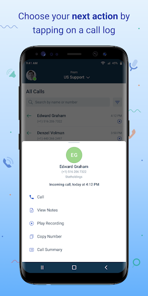 Follow -up -Aktionen Tippen Sie auf einen Artikel in Ihrem Anrufverlauf, um den Anruf zurückzugeben oder die Anrufzusammenfassung, Notizen anzeigen und die Aufzeichnung abzuspielen.