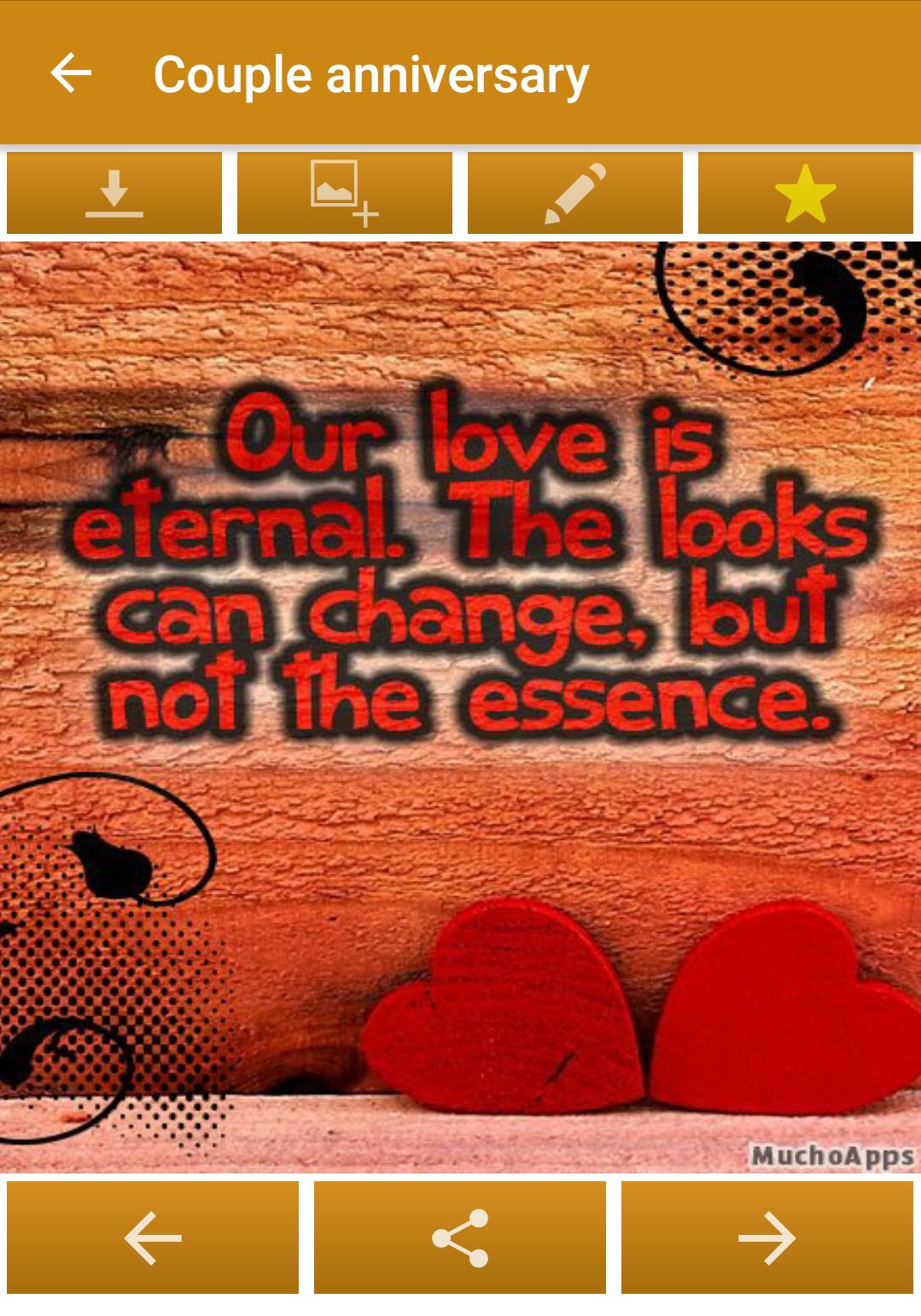 * Wir haben die beste Auswahl an Jubiläumszitaten vorbereitet. Egal, ob Sie sie für einen Hochzeitstag, ein Jubiläum mit Ihrem Partner, Freund oder Ihrer Freundin oder in Kürze für jegliche Art von Jubiläum verwenden möchten. Dies ist Ihre App. Sie können dieses Programm auch verwenden, um neue Ideen von Zitaten zu erhalten, um die Person, die Sie mögen, in Sie gefallen.