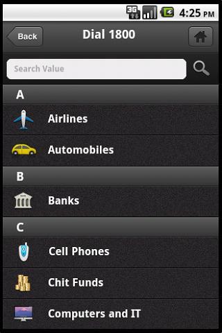Suchen Sie und rufen Sie jede Helpline aus verschiedenen Kategorien wie Fluggesellschaften, Banken, Mobiltelefonen, Bildung, Ehe, Regierungsbehörden, Reisen, Teleshopping und vielem mehr an, die auf Ihrem Smartphone „ Dial 1800 “ -App sind.