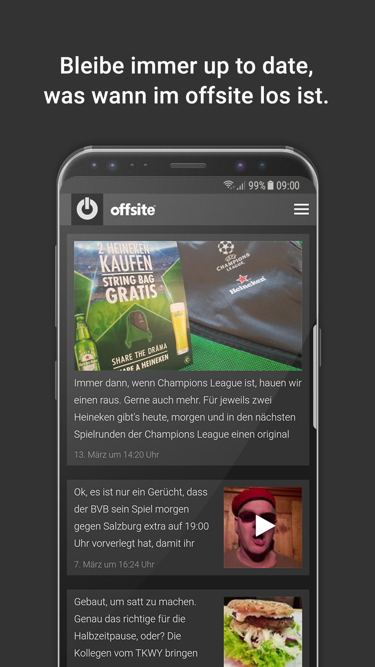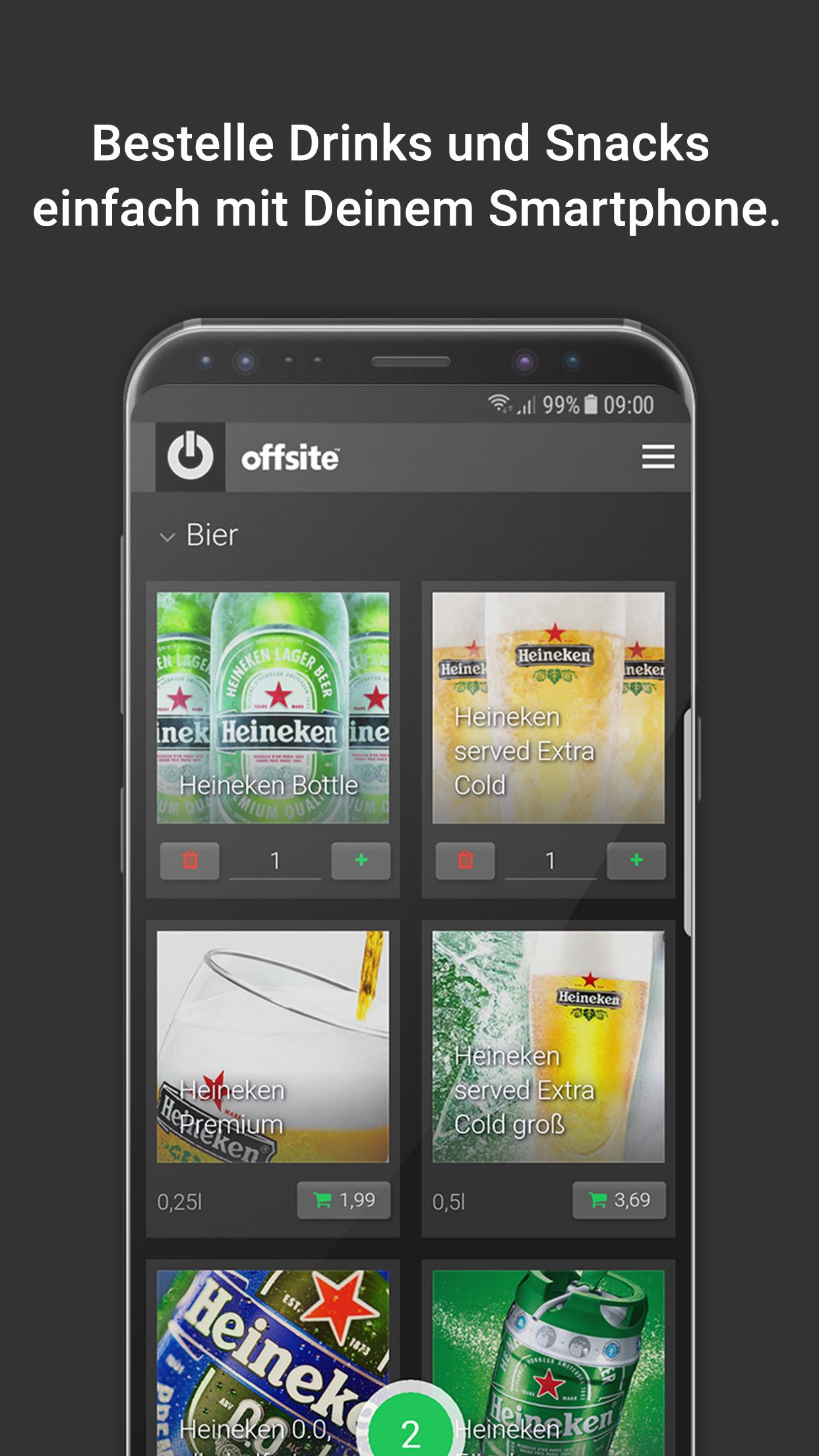 Hol Dir jetzt die offsite-App auf Dein Smartphone und bestelle Dir Deine Lieblingsgetränke direkt an den Tisch. Inklusive automatischer Bezahlung über Deine chayns®card, versteht sich. Bleibe dank Push-Benachrichtigungen immer auf dem neuesten Stand und verpasse so keine Termine oder Aktionen. Natürlich hast Du über das integrierte Intercom auch immer den direkten Draht zum offsite-Team.