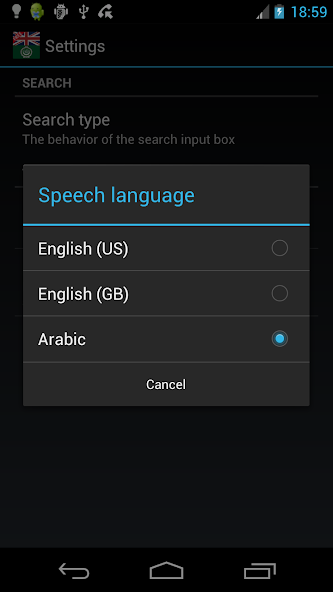 * Hören Sie sich die richtige Aussprache in britischem oder amerikanischem Englisch und Arabisch (falls installiert) anhand von Androids integriertem Text-zu-Sprach-Synthesizer an.