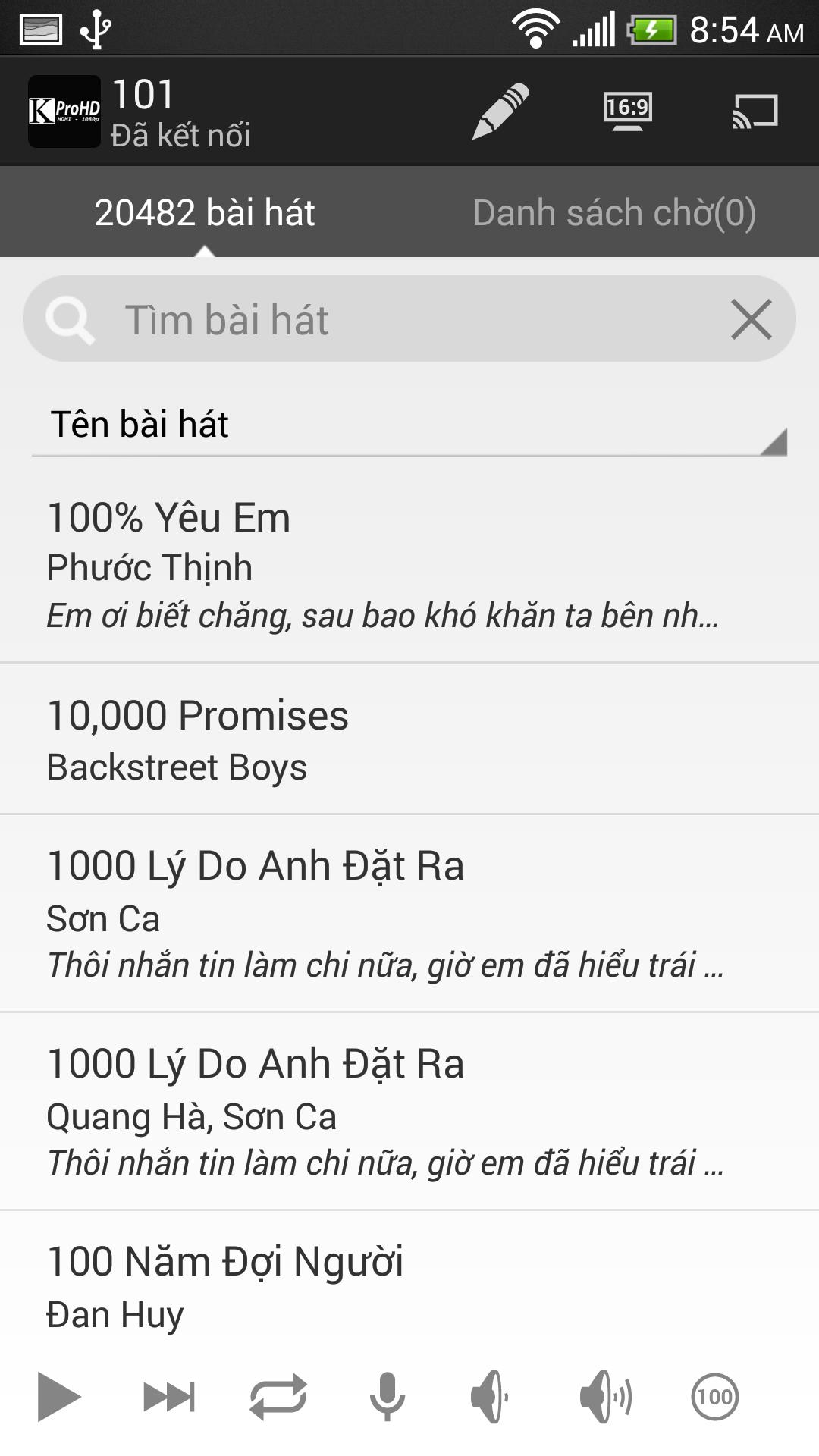 Diese Remote -Anwendung kann Ihnen dabei helfen, nachzuschlagen, schnell zu wählen, zu steuern (Start, Pause, Stopp, Nächstes, Wiederholung, Bildschirmmodus 4: 3, 16: 9, Lautstärke erhöhen oder verringern, die Stimme des Sängers, des Lieblingslieds, der Warteliste) Karaoke Head über Ihr Smartphone/Tablet -Handgerät ausschalten.