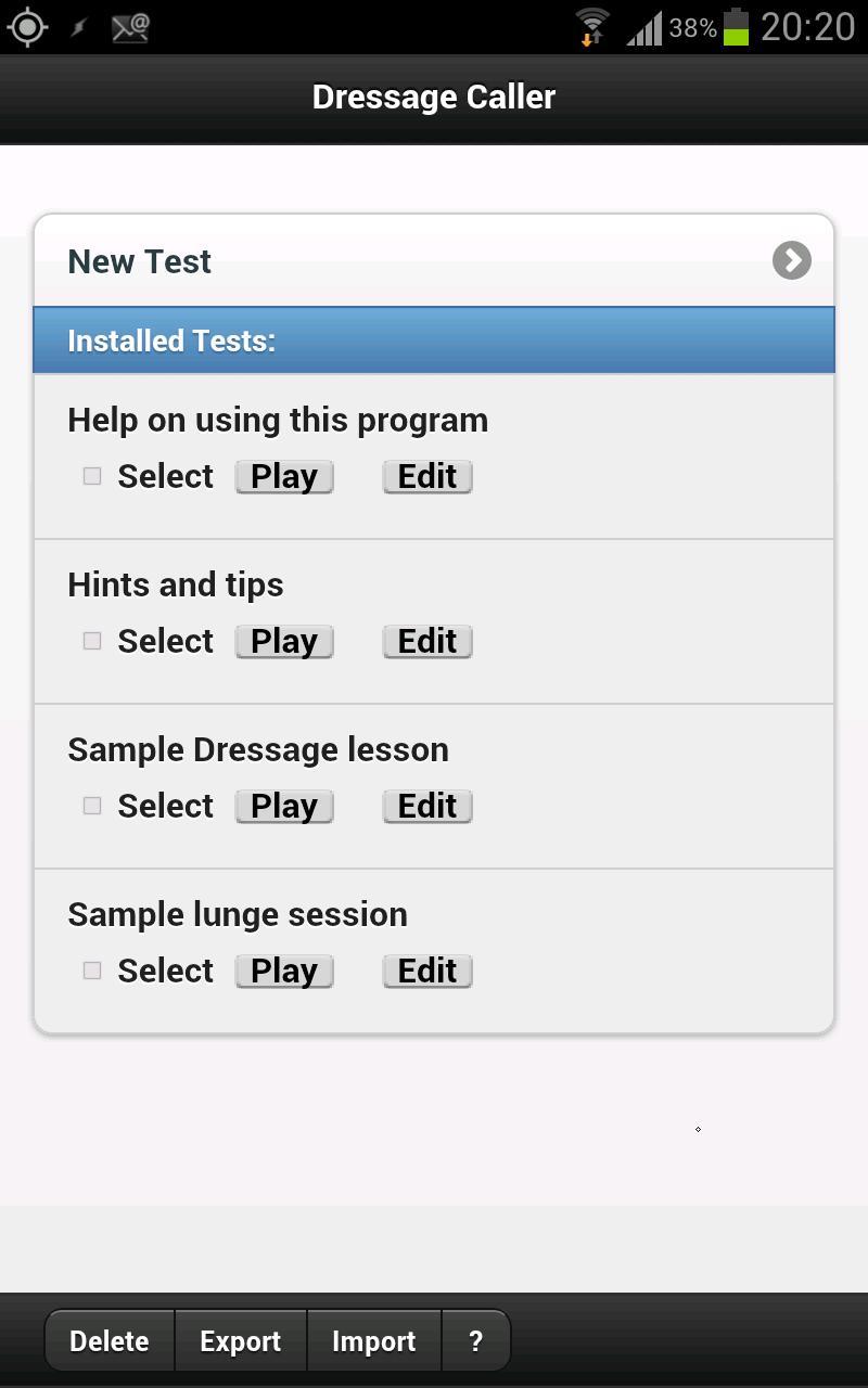 Dies ist die Lite -Version - die Sie auf nur zwei Tests beschränkt. Wenn Sie mehr haben möchten, installieren Sie bitte Dressur Caller Pro im Play Store. Bevor Sie auf die Pro -Version upgraden, exportieren Sie Ihre Tests in Ihre SD -Karte und importieren Sie sie dann wieder in Dressur Caller Pro.