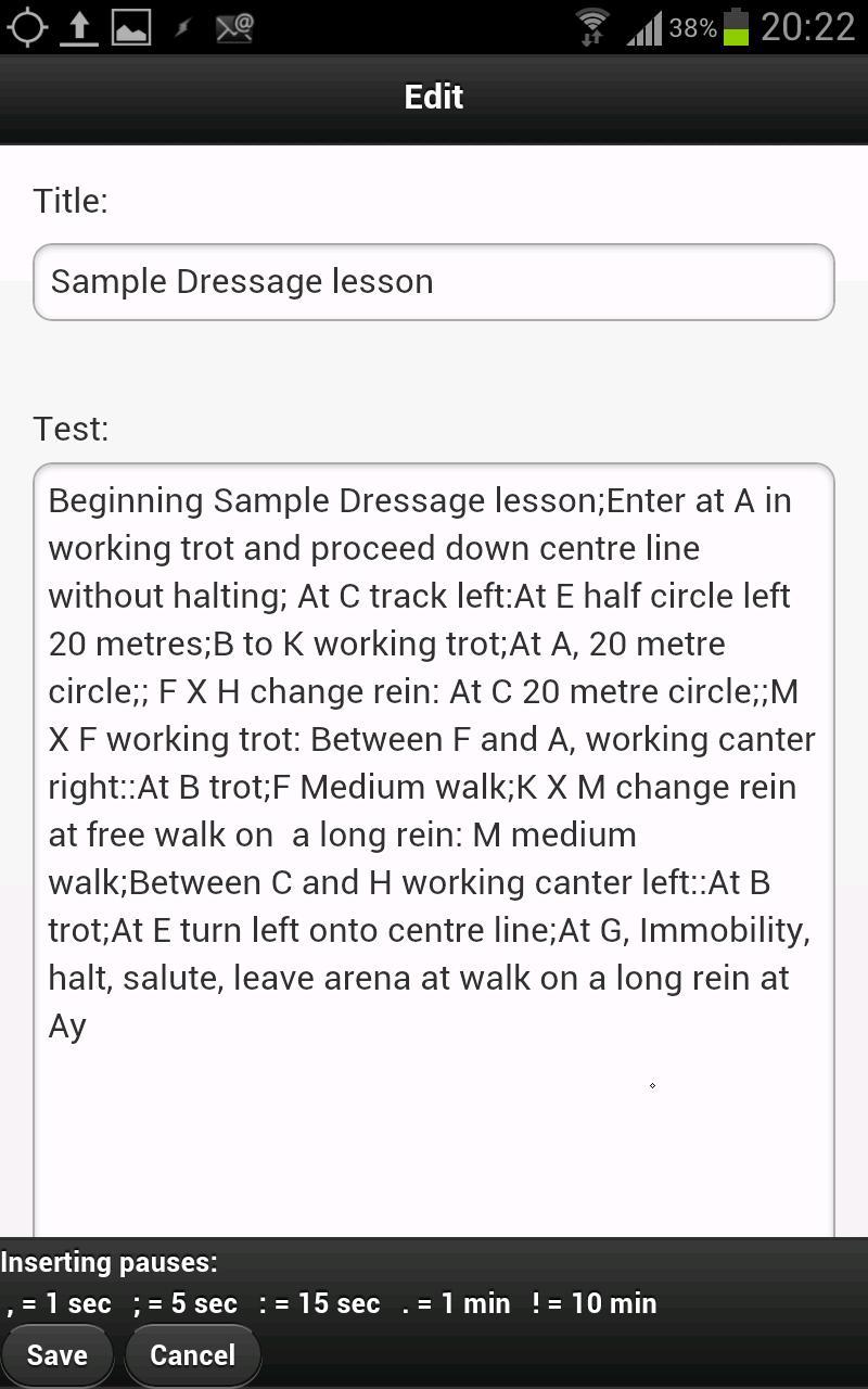 Dressage Caller Lite hilft Ihnen, Ihre Dressage -Tests zu lernen. Sie müssen sich nicht auf einen Freund verlassen, um die Bewegungen anzurufen. Geben Sie einfach den Test als Text ein und lassen Sie sich von der Text-zu-Sprache-Funktion Ihres Telefons zur richtigen Zeit auffordern. Sie trennen jede Bewegung mit einem Interpunktionscharakter (z. B. ein Komma gibt eine 1-Sekunden-Pause, ein Halbkolon für 5 Sekunden usw.).