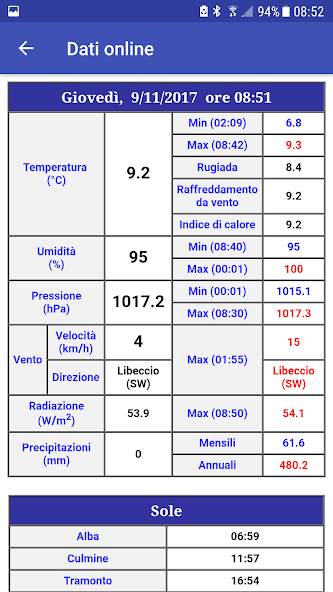 - Temperatur, Luftfeuchtigkeit, Druck, Wind, Regen und Sonnenstrahlung mit maximalen, minimalen und Durchschnittswerten.