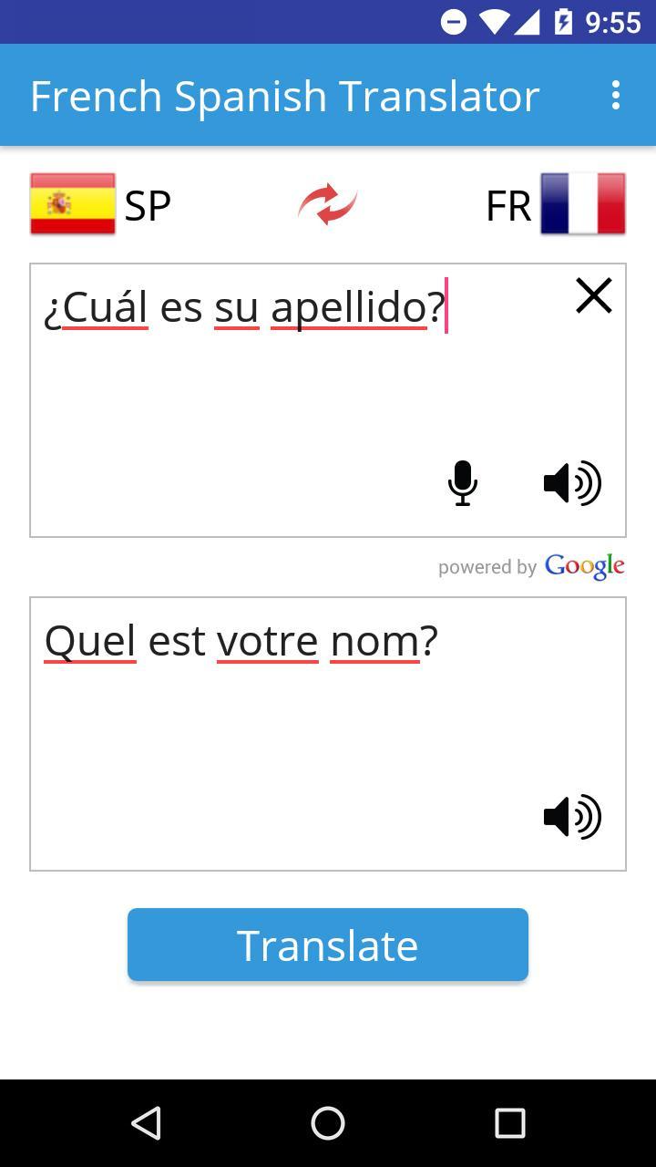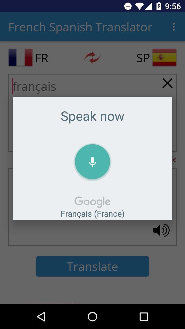 Diese French Spanish Translator ist eine nützliche App, die Ihnen hilft, Wort und Text sowie die Stimme von Französisch nach Spanisch und umgekehrt zu übersetzen.