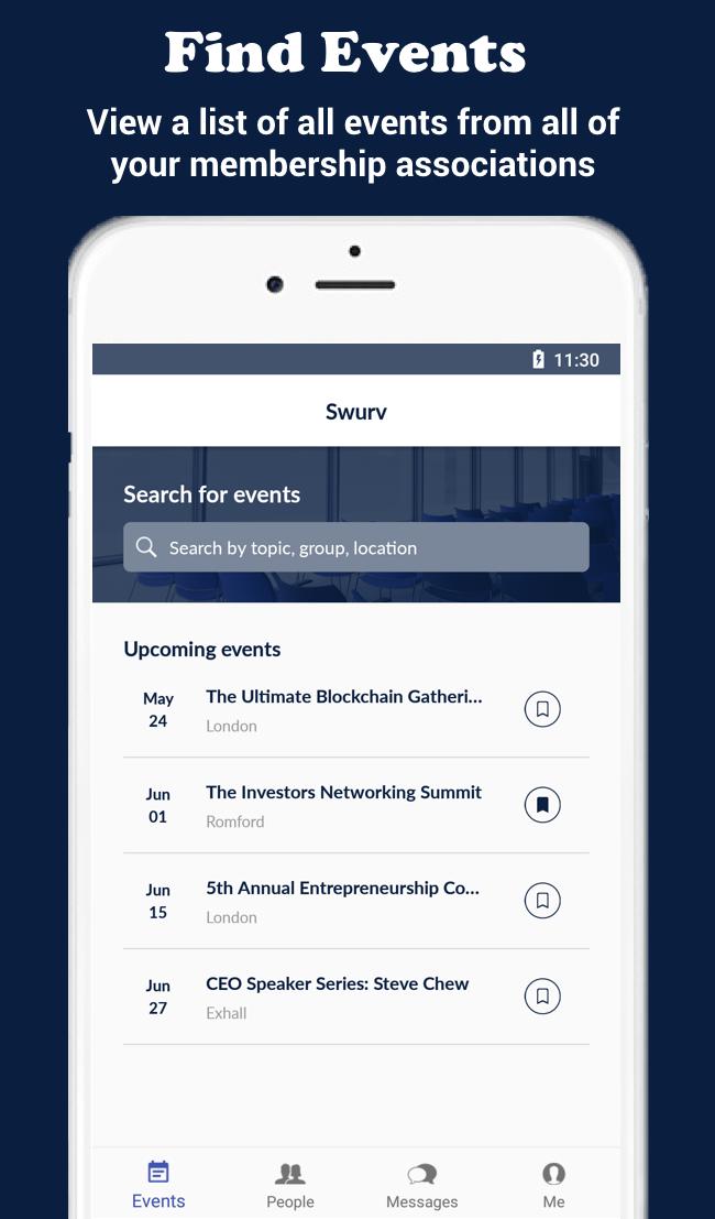 Swurv Pro bringt alle Ereignisse, Kontakte und Kommunikation von all Ihren Mitgliedsverbänden in eine einzige mobile App zusammen.