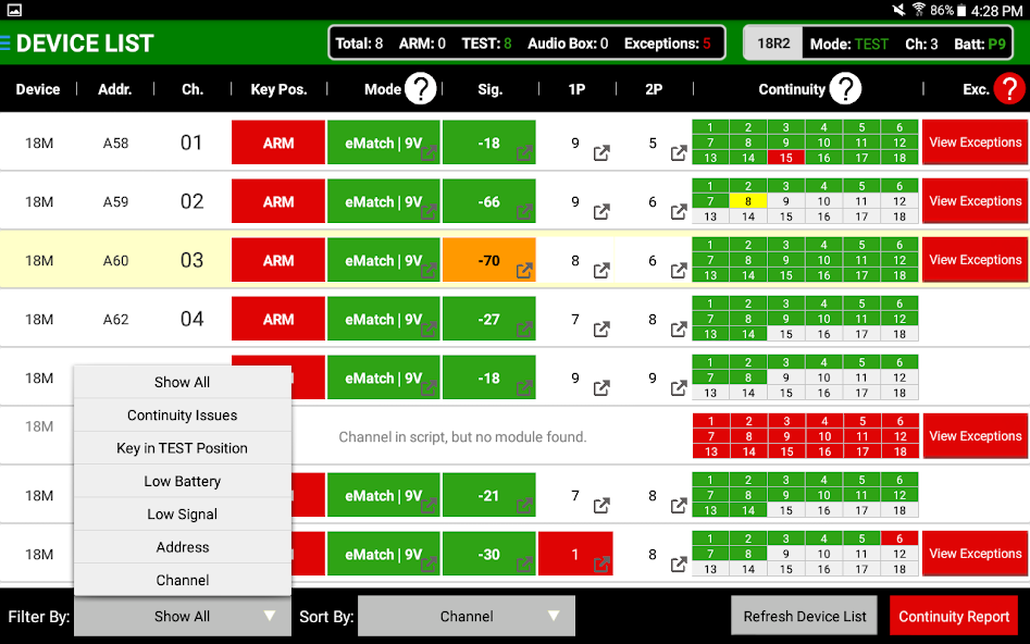 Geräteliste - Detaillierte Auflistung von Modulen, einschließlich Kanal, Adresse, Schlüsselposition, Modus, Signalstärke, Batteriepegeln und Kontinuität.