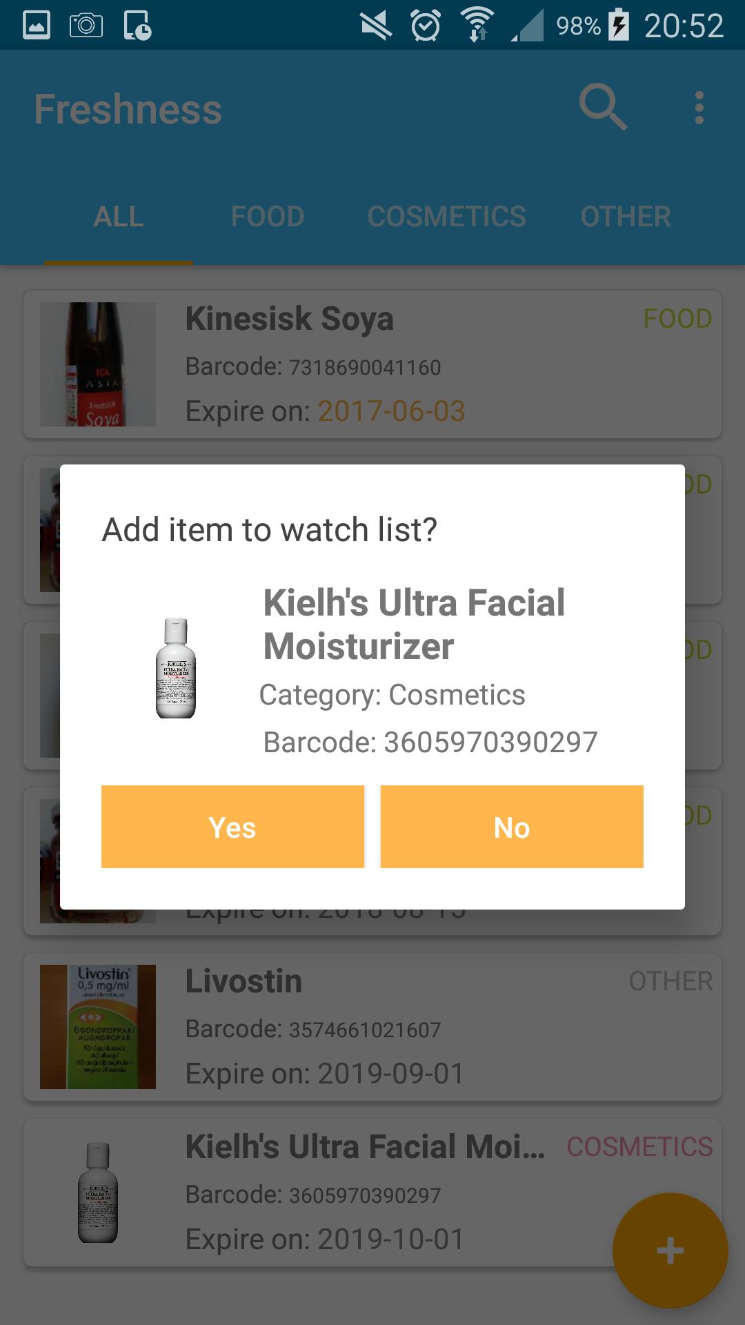 Freshness ist eine Anwendung, die das Ablaufdatum von Artikeln zu Hause verwaltet. Die Benachrichtigung für jeden Artikel wird 1 Monat, 1 Woche und 1 Tag vor Ablauf ausgestrahlt. Der Benutzer kann Barcode scannen, um der Beobachtungsliste ein neues Element hinzuzufügen. Wenn ein neues Element hinzugefügt wird, wird es automatisch zu der eindeutigen Elementliste hinzugefügt, aus der der Benutzer später als Alternative zum Barcode -Scannen auswählen kann. Der Zweck einer einzigartigen Elementliste besteht darin, dem Benutzer das Hinzufügen neuer Uhrenartikel in der Zukunft zu erleichtern. Idealerweise besteht die eindeutige Elementliste aus allen Artikeln, die der Benutzer gewöhnlich kaufen und die Gefahr haben, ohne das Wissen des Benutzers auszufallen. Die individuelle einzigartige Elementliste und das lockere Barcode -Scan sind die Freshness stolz.