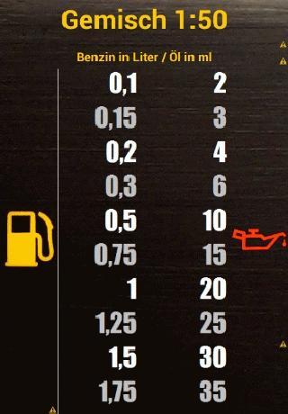 Einfache Mischtabelle für Zweitakt - Motoren, die 1:50 Benzin - Öl - Gemisch benötigen. *