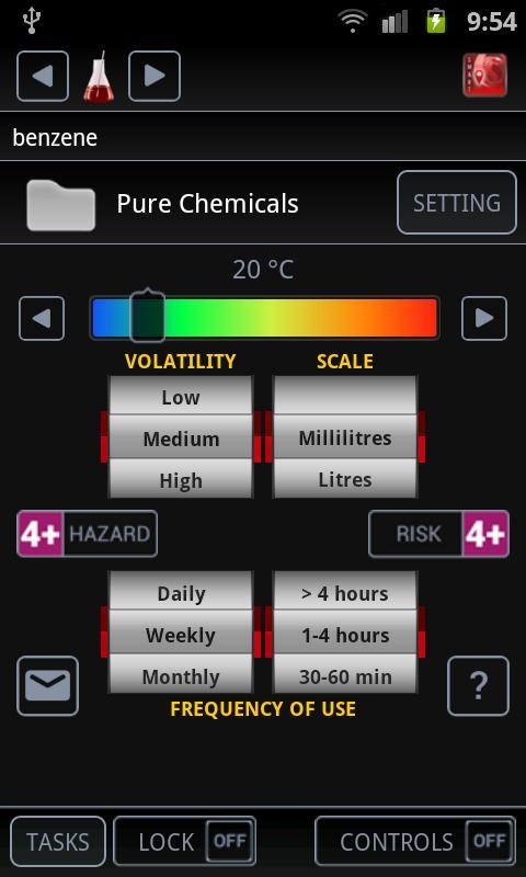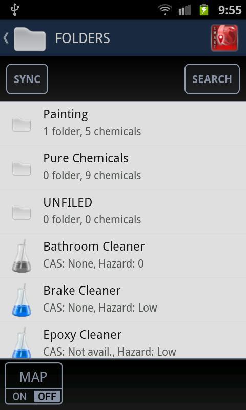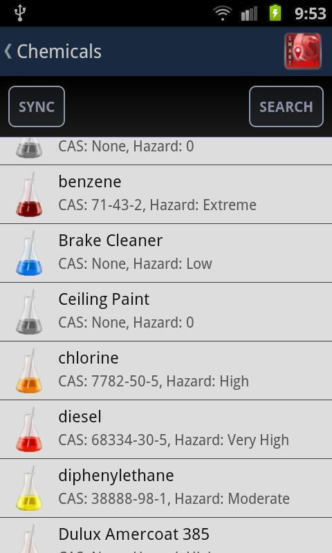 Jedes Chemikaliengeschäft (Ort, an dem Ihre Chemikalien gespeichert werden) kann geo markiert werden, und es werden Benachrichtigungen verwendet, um den Benutzer in der Nähe eines Interesses in der Nähe des chemischen Speichers fordern. Die Anwendung benachrichtigt Sie, wenn Sie sich am Standort befinden, und ermöglicht es Ihnen, das Standortinventar zu öffnen, um die chemischen Informationen, die Gefahren und die Risikobewertungen anzuzeigen.