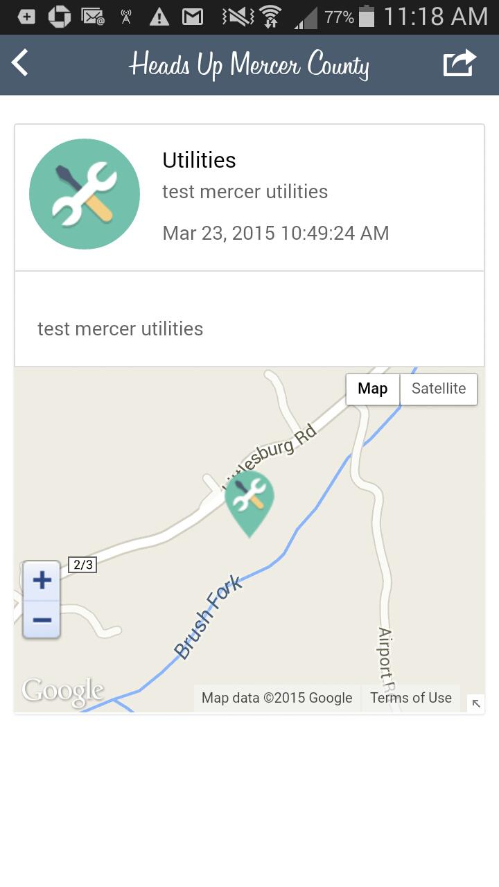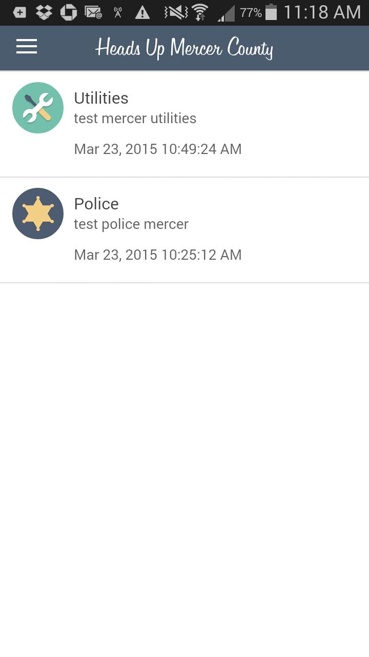 Unified Alerts Notification System für Bewohner von Mercer County. und umliegende Gebiete. Mit der App können Benutzer über Google Cloud Messaging wichtige Informationen erhalten, die von vertrauenswürdigen Delegierten aus den Gemeinden des Gebiets eingegeben wurden.