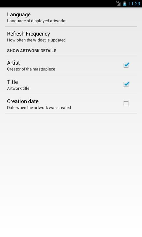 Widget kann sehnlich sein, sodass Sie die Größe auswählen können, die Ihren Anforderungen entspricht. Dieses Programm kann Informationen über Kunstwerke in Katalanisch, Englisch, Französisch, Deutsch, Italienisch, Polnisch, Russisch, Spanisch und Ukrainisch zeigen.