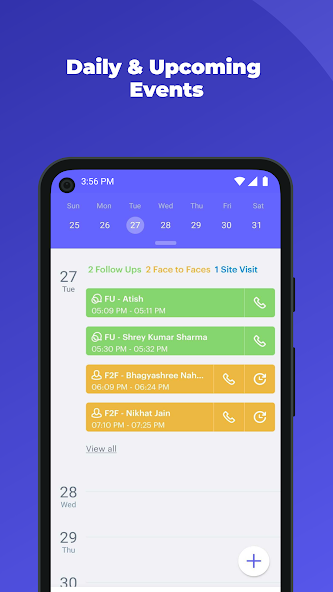 Die Verkaufs-App ermöglicht Vertriebsagenten, indem sie ihre Leads und täglichen Aktivitäten verwalten können. Es ist für die Mitarbeiter von heute konzipiert, die nur ein mobiles und benutzerfreundliches Erlebnis verwenden. Es ermöglicht Vertriebsmitarbeitern, mit Kunden nachzuverfolgen, Anrufe über Telefon und Web zu verwalten, die Erkennung der eingehenden Anrufer -ID basierend auf den zugewiesenen Kunden zu erfassen und die nächsten Aufgaben zu automatisieren, basierend auf dem Status von Anrufen (Zeitdauer, verbunden, abgelehnt, erfolgreich) mit den Kunden.