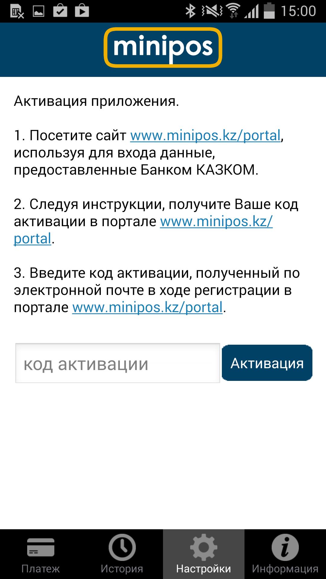 Der Antrag von Minipos erfordert den Aktivierungscode, der von Kazkom nach der Unterzeichnung einer entsprechenden Vereinbarung bereitgestellt wird.