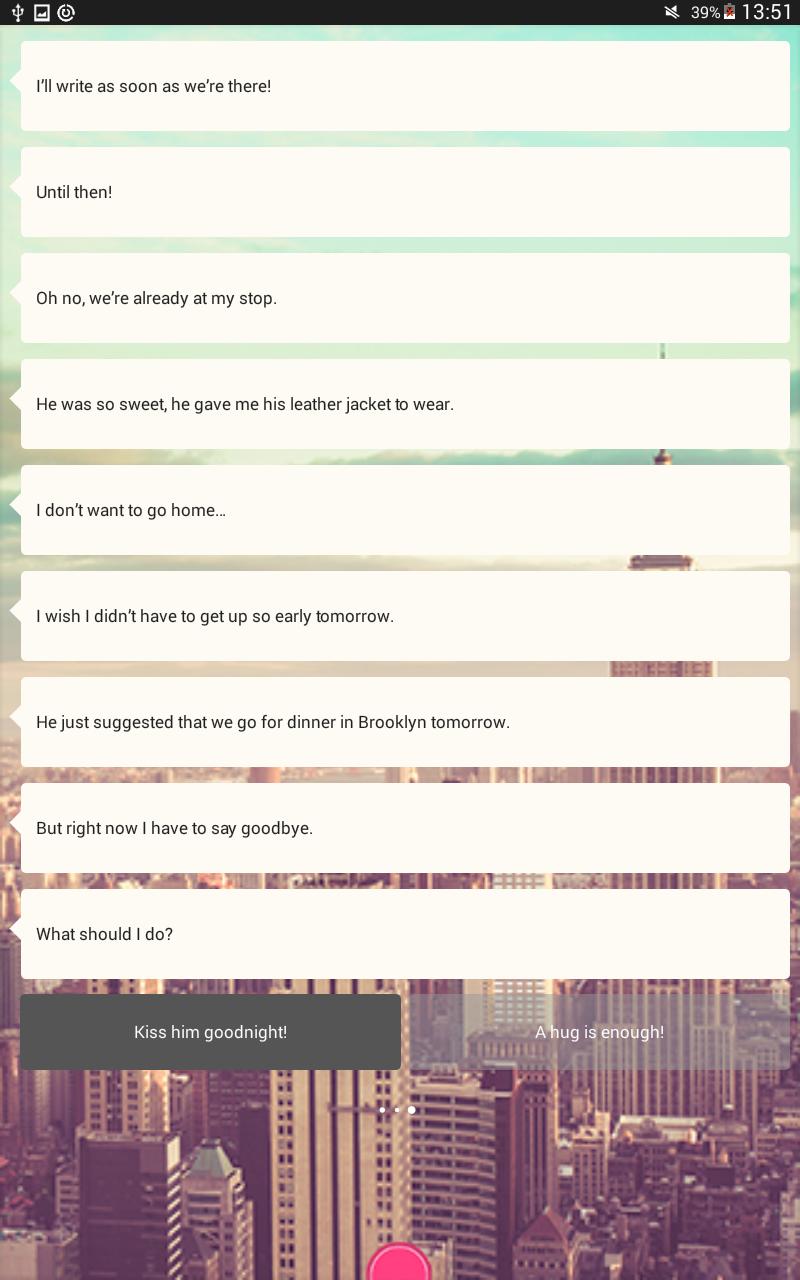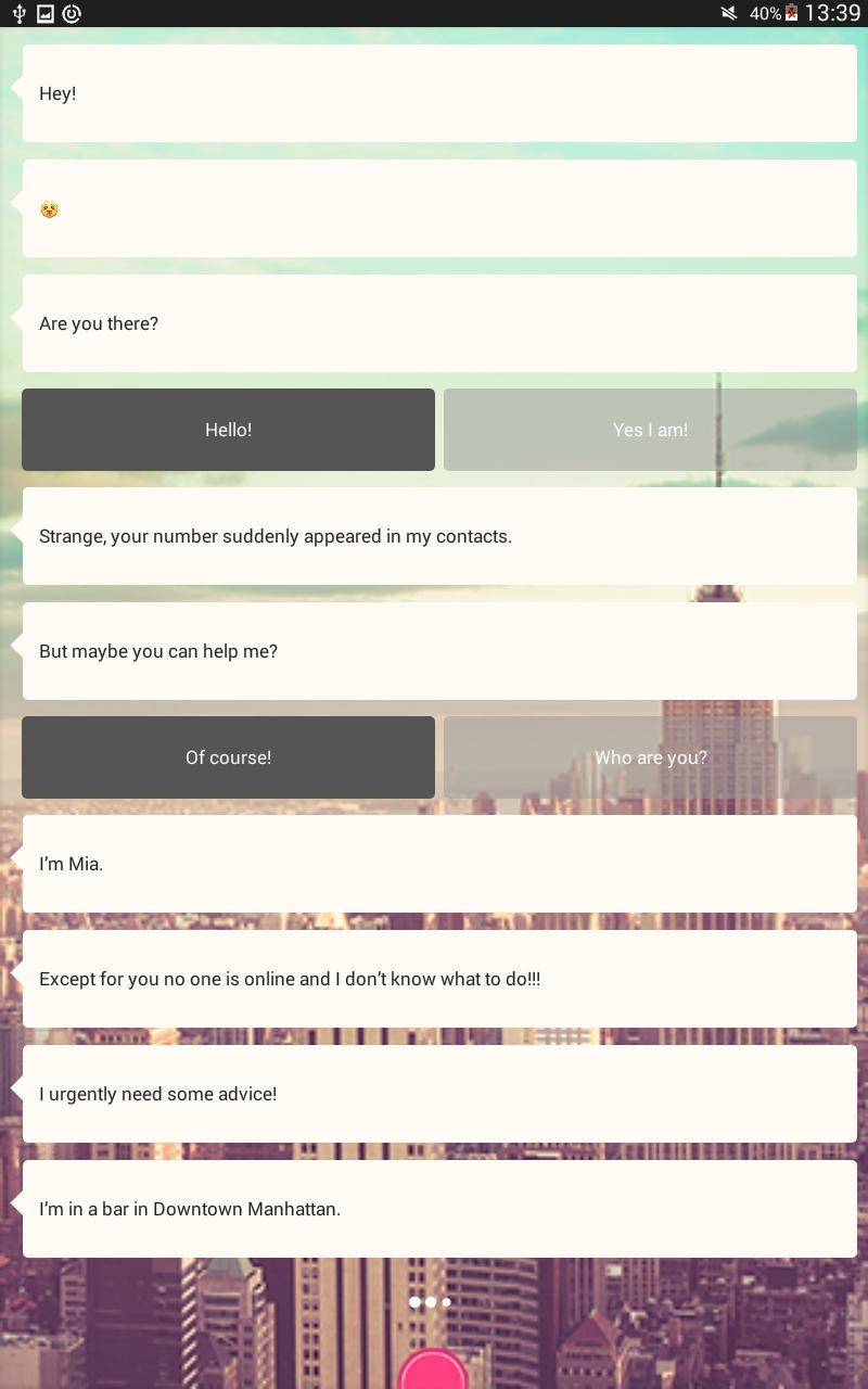 Die App erzählt die Geschichte von Mia, einem einzigen Mädchen im städtischen Dschungel von New York. Dating ist wirklich nicht einfach und wenn sie ihren Prinzen in einer Bar entdeckt, braucht sie dringend gute Ratschläge. Zum Glück hat sie dich! Da Sie plötzlich ihren einzigen erreichbaren Kontakt sind, erklärt sie Ihnen ihre Situation. Jetzt ist ihr Liebesleben in deinen Händen!