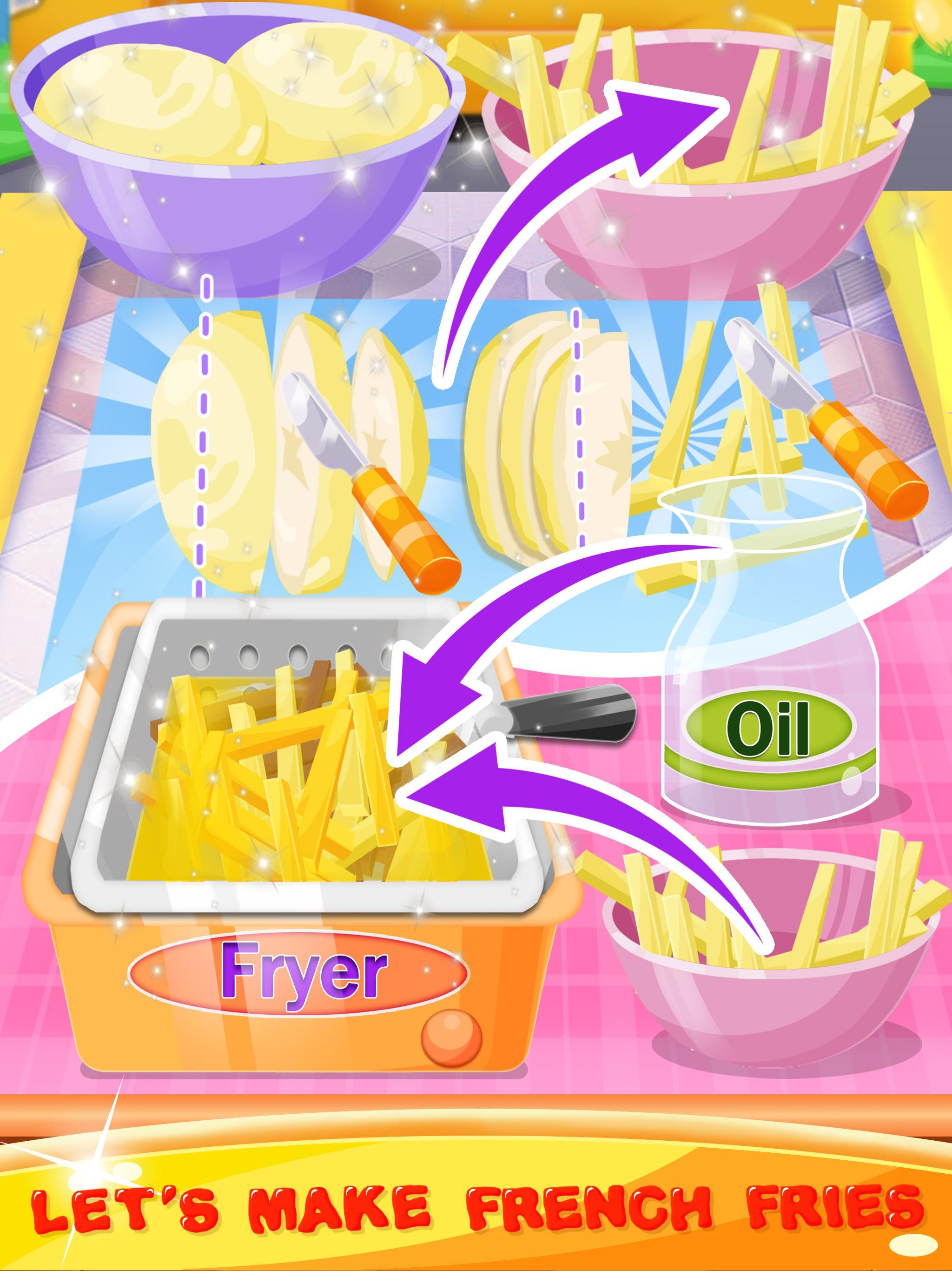 • Ziehen Sie, um Ihre Pommes in das Öl zu gießen und beobachten Sie, wie das heiße Öl brutzelt, Blasen und frittiert sie zu goldbraun.