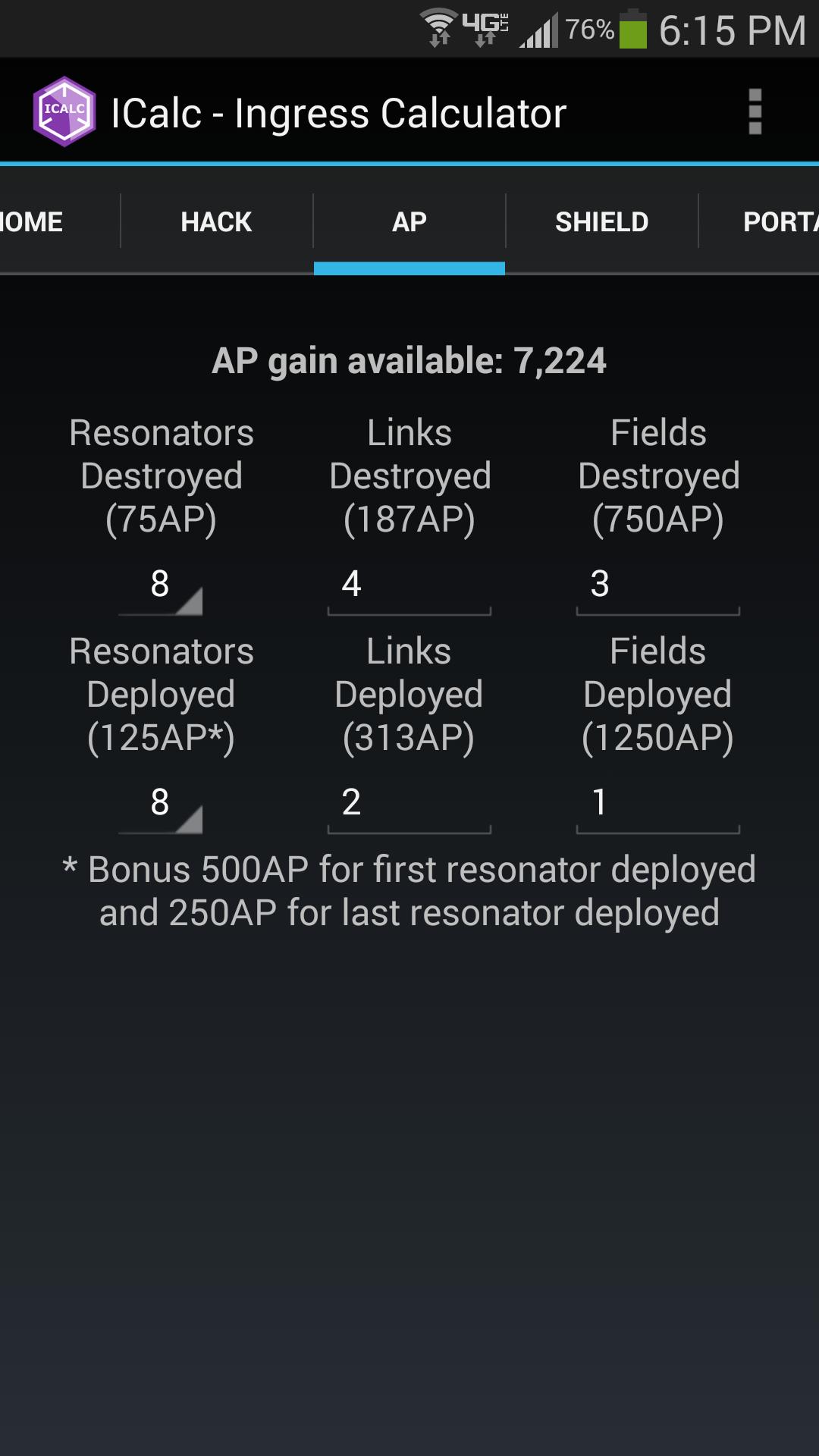 AP Calc - berechnet die Gesamtmenge an AP, die durch Neutralisierung von Portalen -Resonatoren, Links und Feldern sowie den Wiederaufbau von Portalen -Resonatoren, Links und Feldern verdient werden kann.