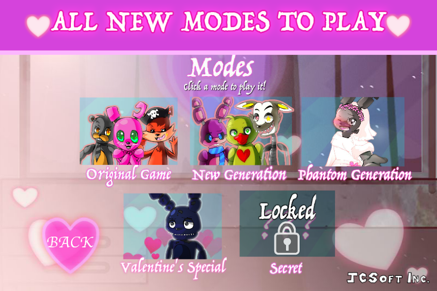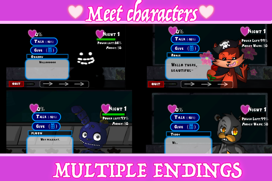 Sie haben fünf Tage lang nichts zu tun. Wählen Sie sich für die Interaktion mit den Bewohnern in den Zimmern oder möchten Sie nur die Hallen für Geld fegen? Es liegt an Ihnen! Finden Sie Ihre Lieblingsanimatronik! Sprechen Sie mit ihnen oder geben Sie ihnen Geschenke, um ihre Liebe zu Ihnen aufzubauen. Sie haben fünf Versuche und fünf Tage, um die Liebe Ihres Lebens zu finden.