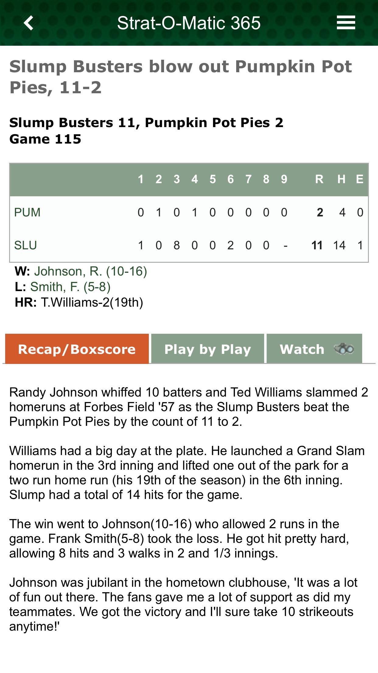 o Studieren Sie jeden Morgen die Zusammenfassung, Boxscore und Play-by-Play der Spiele der letzten Nacht. Wer führt die Liga in Homern an? Welcher Slugger hat den höchsten Schlagdurchschnitt im Vergleich zu Linken? Welcher Pitcher bekommt die am meisten laufende Unterstützung? Verfolgen Sie während der gesamten Saison über 60 STAT -Kategorien. Die Liebe zum Detail von Strat-o-Matic ist beispiellos.