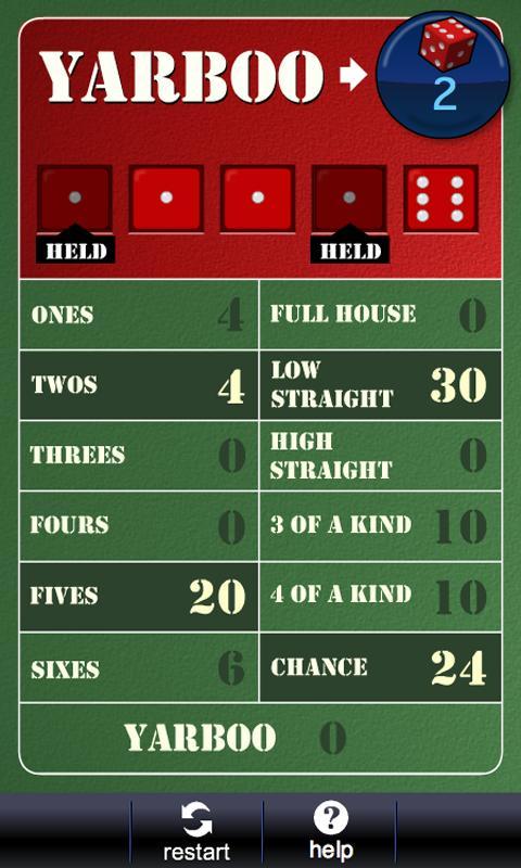 Yarboo ist eine Version des klassischen Pokerwürfelspiels. Für schnell freundliches Spiel gebaut