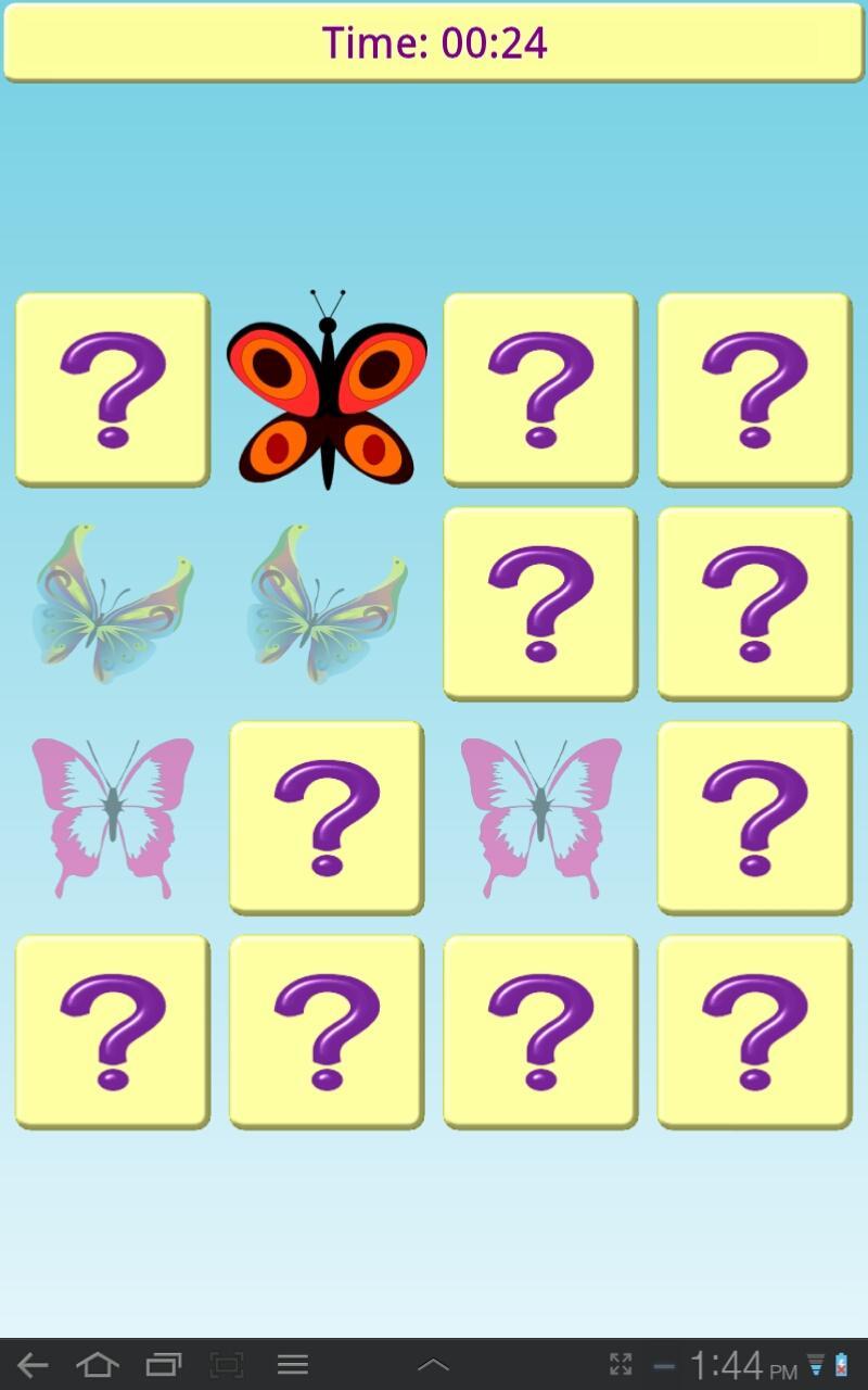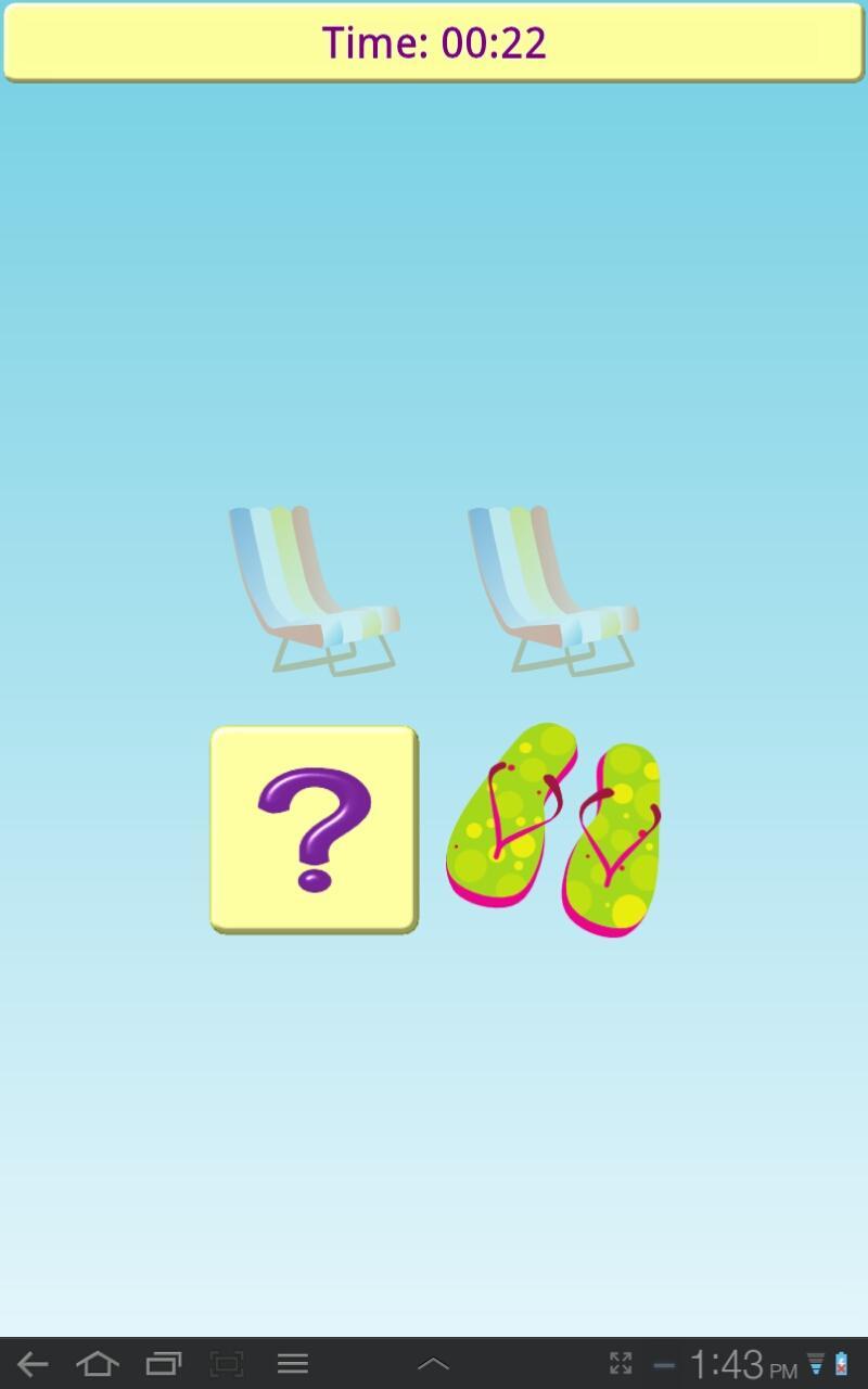 Es gibt drei Sommerthemen: Schmetterlinge, Strand und Picknick. Es gibt sechs Schwierigkeiten, von den super einfachen 2x2 -Fliesen bis zu den härtesten 8x6 -Fliesen. Dieses Spiel schärft Ihr Gedächtnis und Ihr Fokus, während Sie Spaß haben. Dies ist ein Spiel für alte und junge.