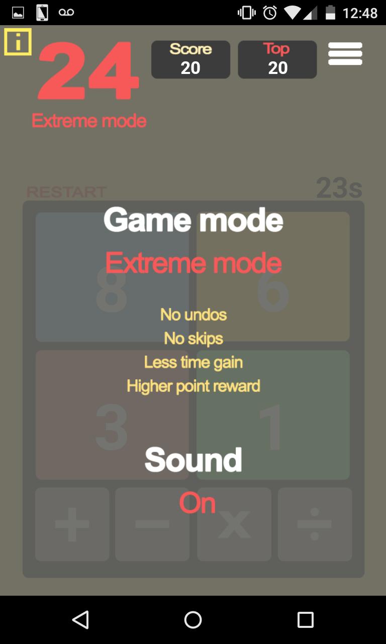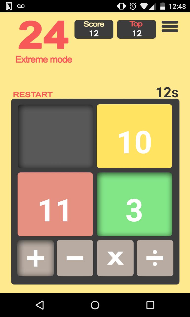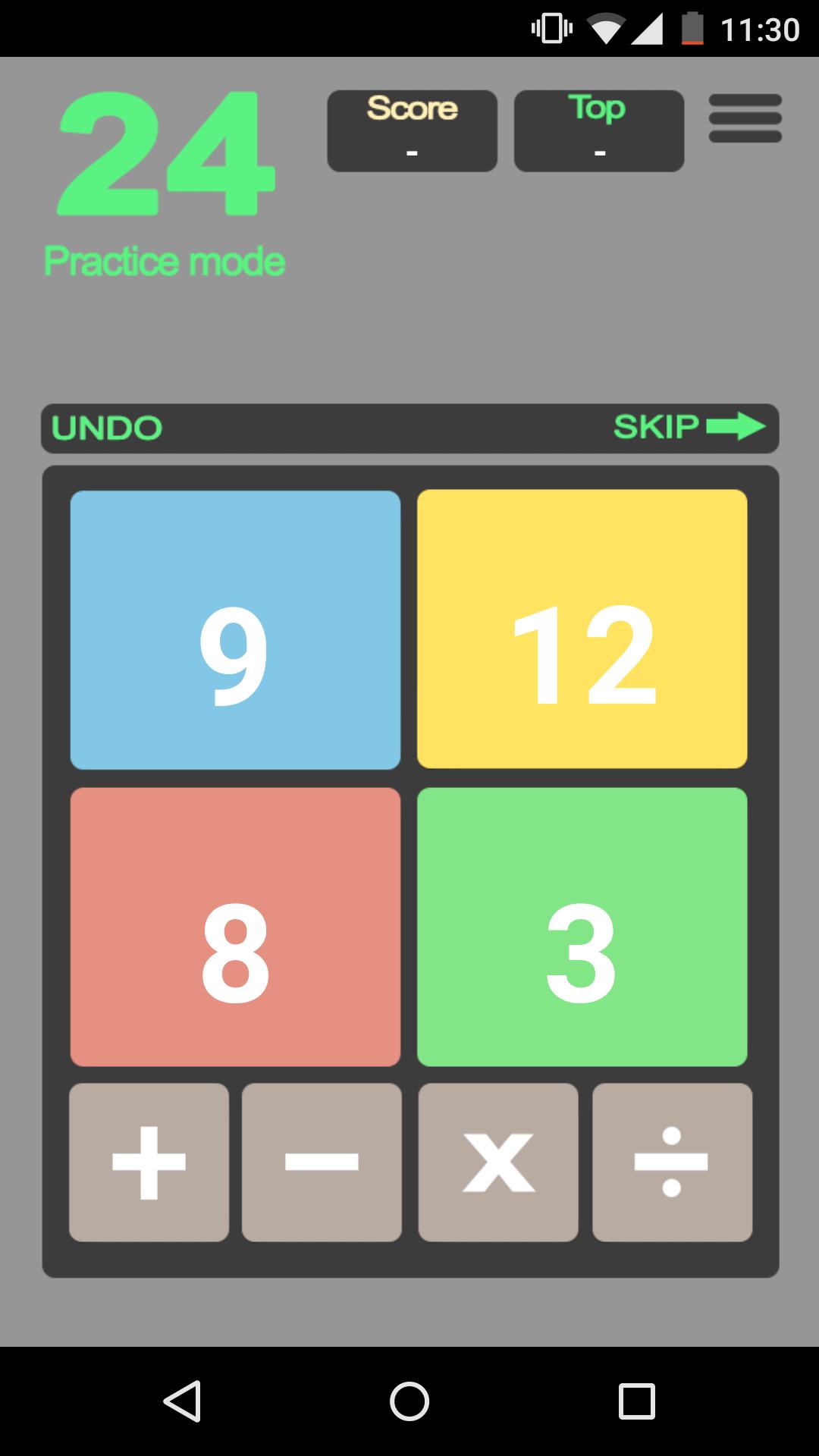 Sie beginnen mit 90 Sekunden, haben bis zu 3 Undosen und die Verfügbarkeit zu überspringen, wenn Sie stecken bleiben! Jedes Mal, wenn Sie 24 erhalten, wird die Zeit für die Uhr hinzugefügt und Sie erhalten "Plus 1" -Kombination, die zu Ihrer Punktzahl hinzugefügt wird. Max Combo ist 5. Der Haken ist, Sie verlieren die Kombination und Zeit, wenn Sie überspringen oder nicht 24 erhalten. Wenn die Zeit Null erreicht, verlieren Sie.