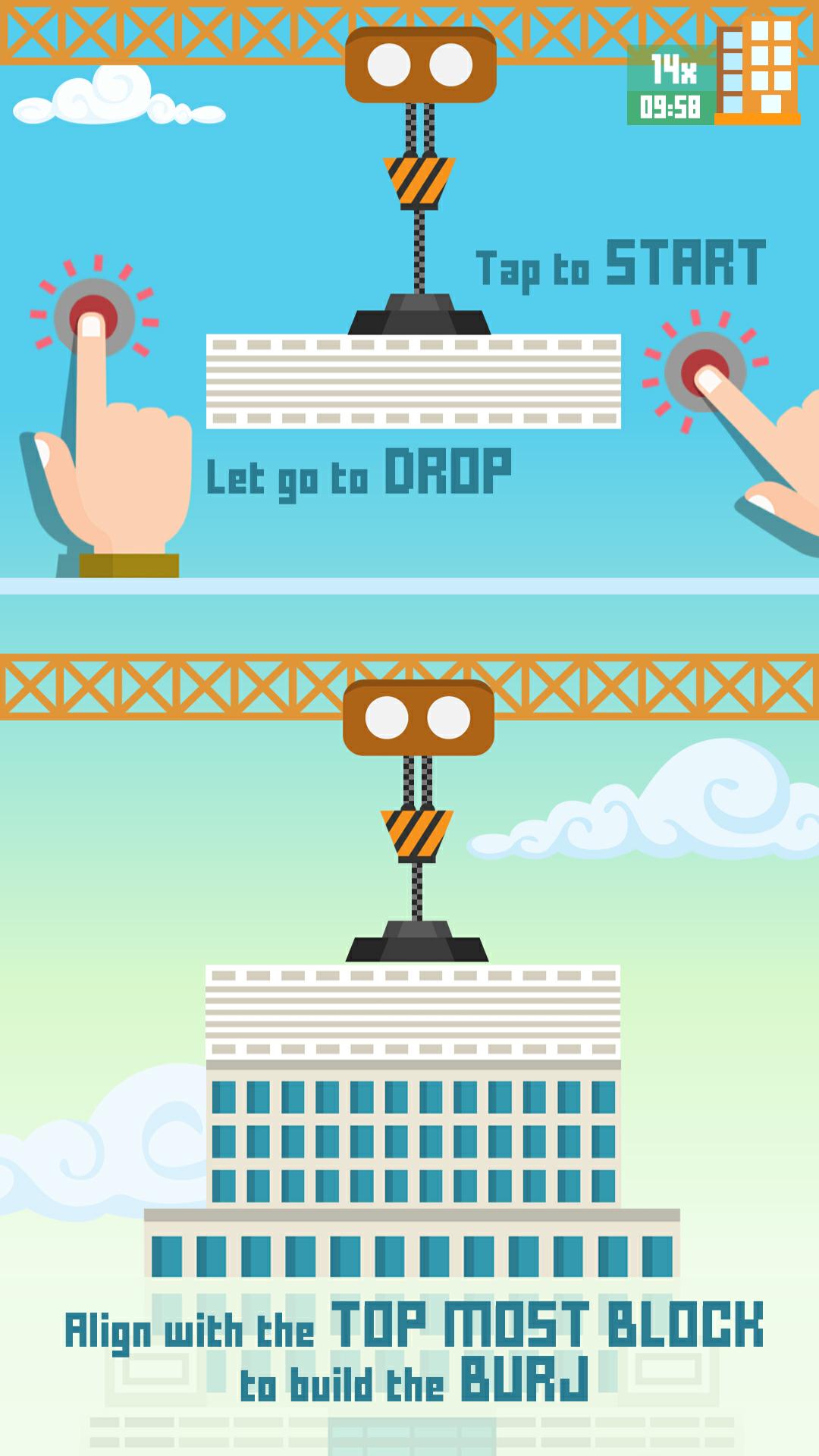 Große Blöcke bewegen sich von einer Seite zu einer anderen und Sie müssen entscheiden, wann Sie sie mit einem Hahn auf Ihre Uhr an den besten Ort platzieren müssen. Wenn es nicht perfekt auf dem Block darunter landet, werden Sie eine Scheibe des Blocks fallen - so ist der nächste Block nicht so groß wie vorher. Sie erhalten eine winzige Fliese, um den Block zu landen, was es schwierig macht, einen Hochturm zu bauen.