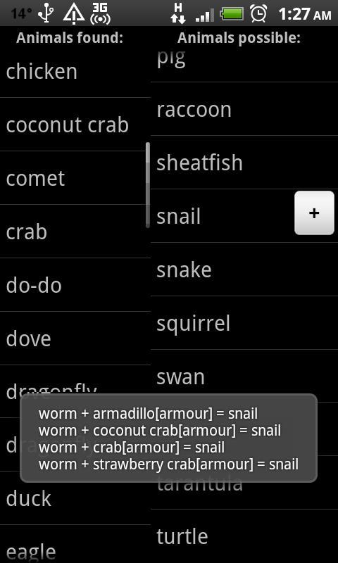 Eine Arbeit dafür wäre, die Combos nicht in den Speicher zu laden (es gibt übrigens etwa 58.000 Kombinationen), sondern nur die erste verfügbare Kombination, dh nur ein Tier anzeigen, das Sie herstellen können. Dies würde den Speicher und die CPU -Verwendung verringern. Durch die Berechnung aller Combos warten Sie auf Alter, um sie herauszufinden, wenn Sie ein neues Tier hinzufügen.