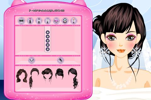 Wählen Sie Ihr Lieblings -Hochzeitskleid und Ihre Dekorationen wie Kopfschmuck, Blumenstrauß, Ohrringe und Halskette, um ihr die süßeste und glücklichste Brautin zu verkleiden. Führen Sie außerdem eine stilvolle Makeover mit Erröten, Lidschatten, Lippenstift, Haarschnittstil usw. Machen Sie ein perfektes Design für diese schöne Braut!