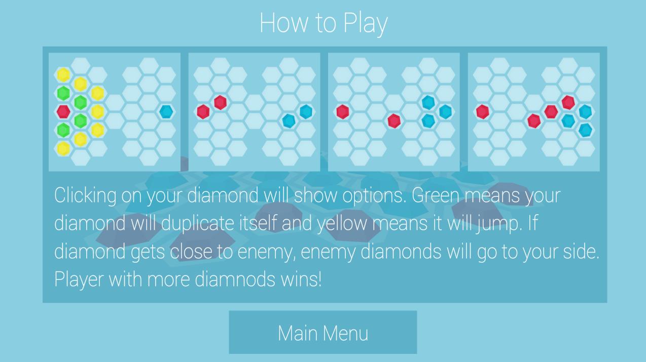Wenn Sie auf Ihren Diamanten klicken, werden Optionen angezeigt. Grün bedeutet, dass Ihr Diamant sich dupliziert und gelb bedeutet, dass er springt. Wenn Diamond dem Feind nahe kommt, werden feindliche Diamanten an Ihre Seite gehen. Spieler mit mehr Diamnoden gewinnt!