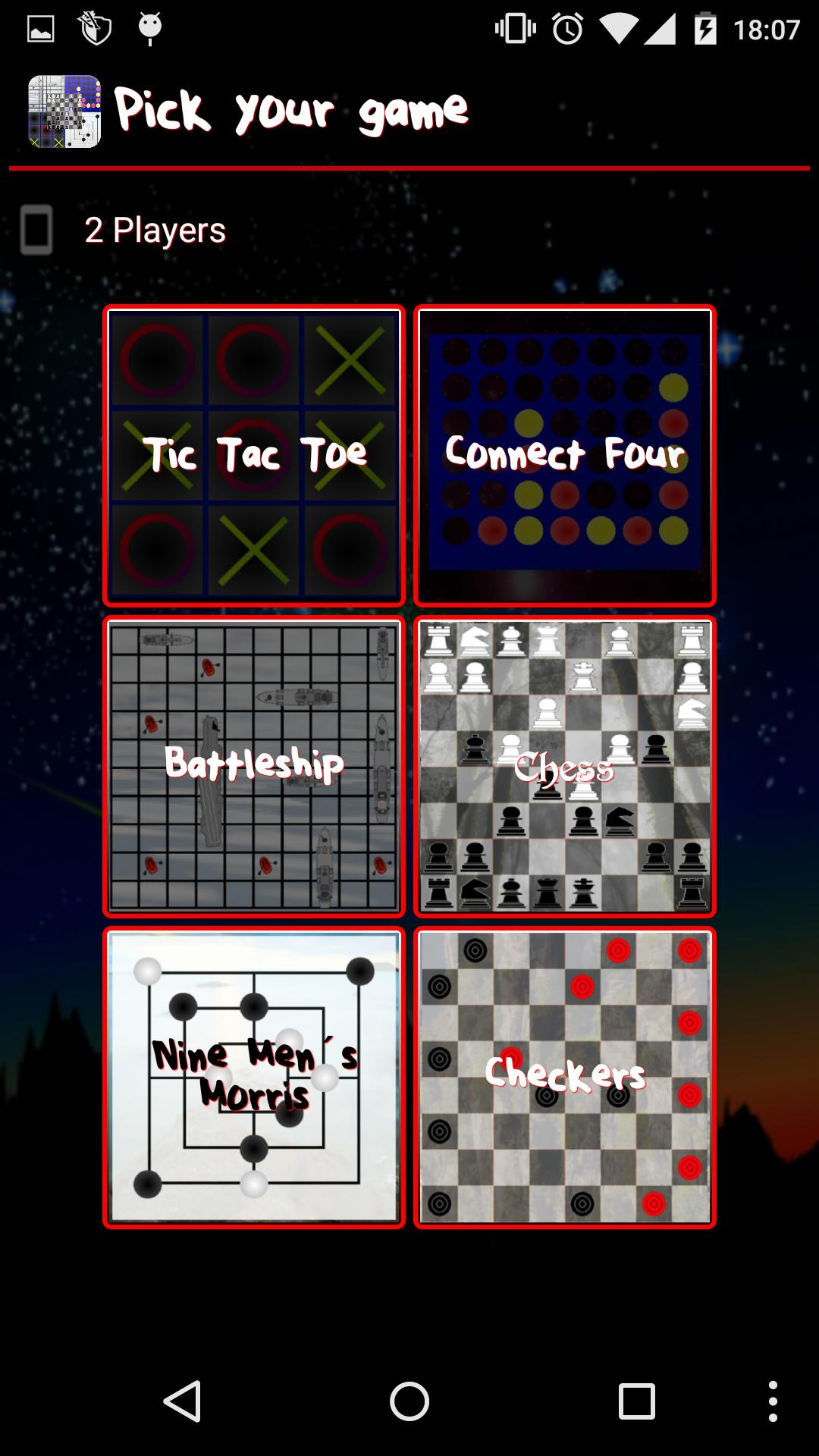 Spielen Sie neun Männer Morris, Connect 4, Battleship, Chess, Tictactoe, Reversi und Checkers gegenüber Ihren Freunden, alles in einer App!