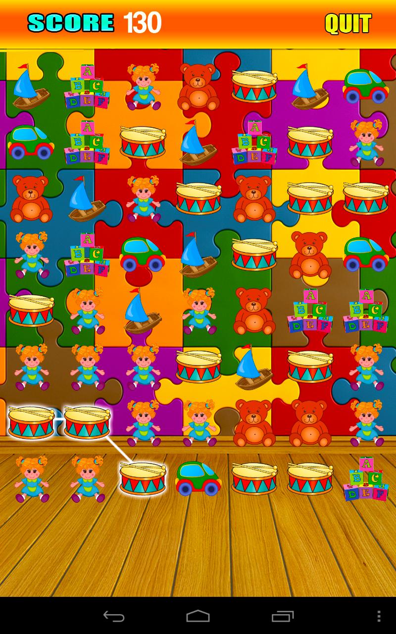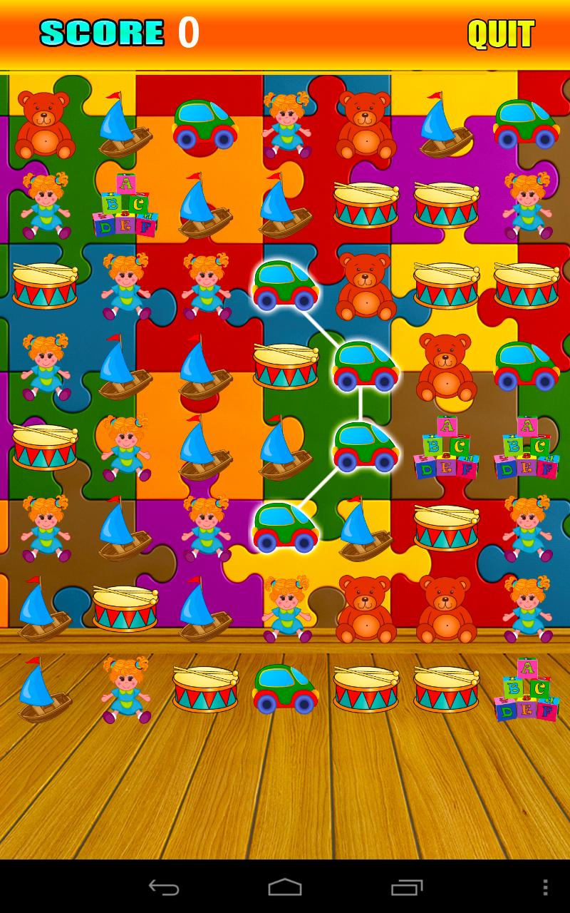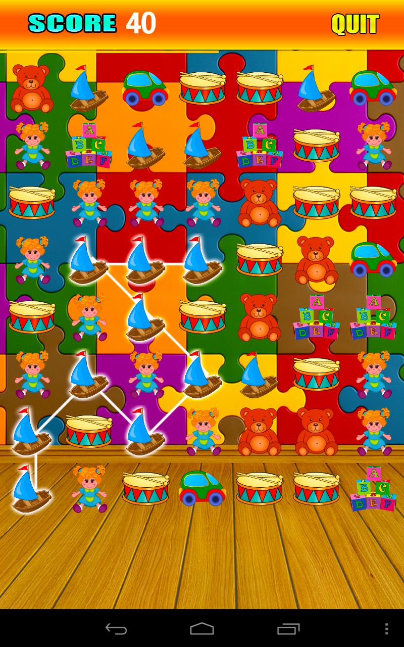 * Match und erstellen Sie Ihre eigenen Ziele, um Ihre beste Partitur zu erreichen! Schließen Sie schnell und einfach an und zeichnen Sie eine Linie über farbenfrohes atemberaubendes Spielzeugdesign mit glücklichen Puppen, klassischen Spielzeugsegelbooten, niedlichen Spielzeugautos, schönen Teddybären, Bildungsblöcken mit ABCs Buchstaben und winzigem Spielzeug -Snare -Drum.