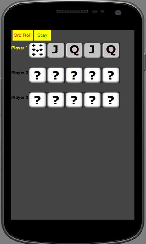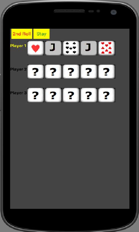Dies ist der 5 -Würfel Cubilete bis zu 5 Spieler. Einfach zu bedienen und basierend auf den Cubilete . Der Spieler wiederum könnte je nach vorheriger Spieler bis zu 3 Kurven haben. Wenn der Spieler die Sterbe halten will (sperren), muss er sie nur berühren, und auf der nächsten Rolle bleibt der Würfel so wie es ist; Wenn er/sie sich verbinden will, dann berühren Sie den Sterbchen erneut, um sich zu entsperren. Wenn ein Spieler beschließt, bei aktuellen Würfeln zu bleiben und mehr Kurven verfügbar zu haben, haben die nächsten Spieler nicht mehr Kurven als der Spieler, der sich entscheidet, zu bleiben. Der Gewinner ist die höchste Punktzahl.