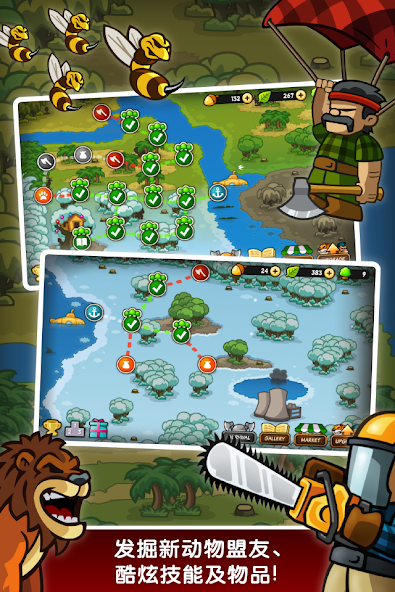 Nehmen Sie heftige Tiere zusammen und verteidigen Sie den Wald gegen bösartige Baumschneider!