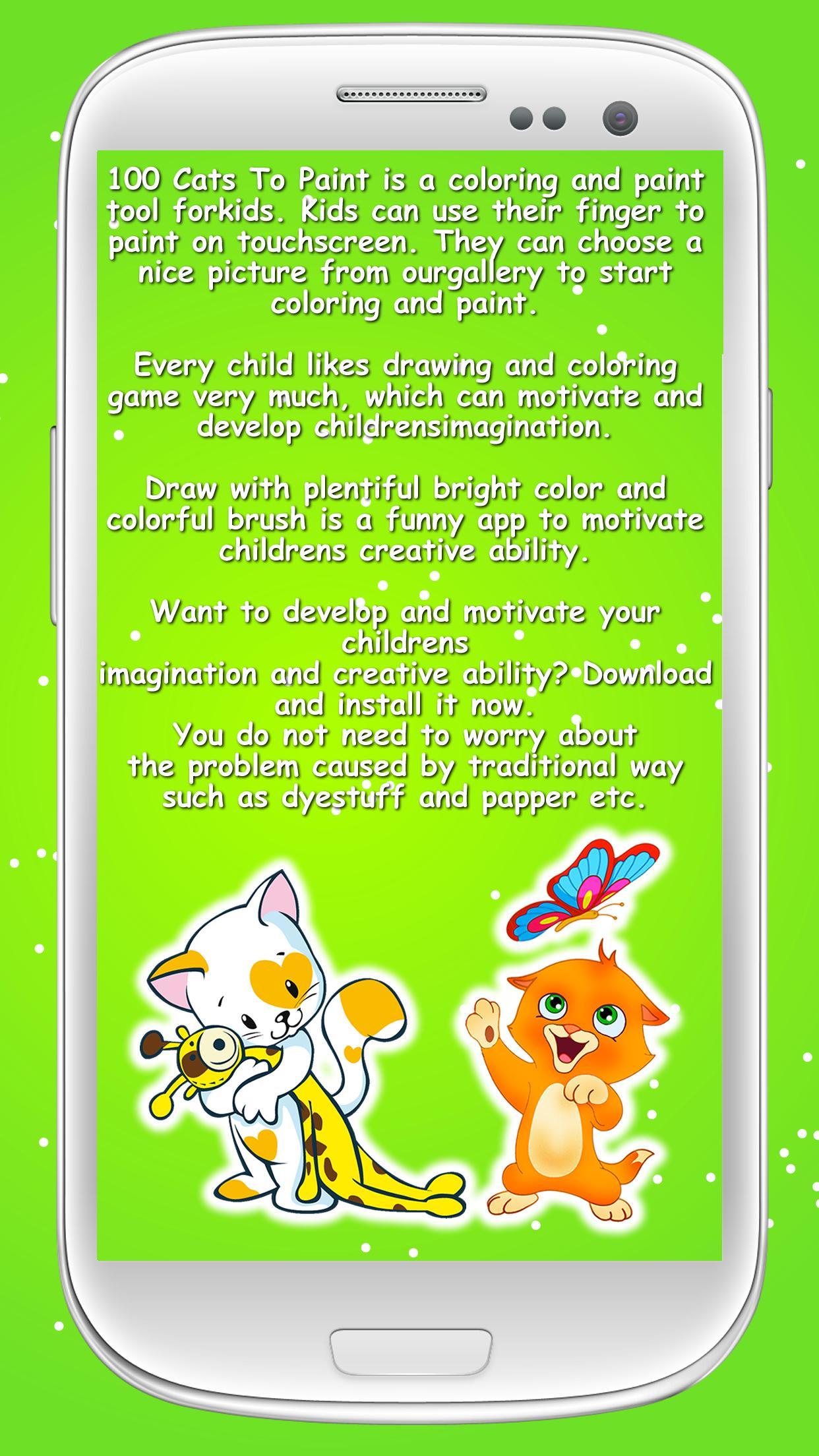 To 100 Cats To Paint is an entertaining application, easy to handle and in addition, serves to motivate the creative capacity of the children in any age. Mit dieser Anwendung ist die Belustigung für Ihre Kinder garantiert. Ein einfaches Design, einfach und genau zu den Kapazitäten des Kindes, ermöglicht jedem, der es ohne Probleme bearbeitet.