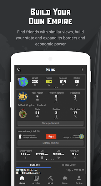 Sie werden an Luft-, Land-, See- und Weltraumkriegen teilnehmen, Ihre eigenen Zeitungen erstellen und Artikel veröffentlichen, Regionen der realen Welt verwenden, um Ihren eigenen Staat zu bilden und seine Regierungsform zu wählen: Diktatur oder Präsidentschaftsrepublik? Es ist deine Wahl!