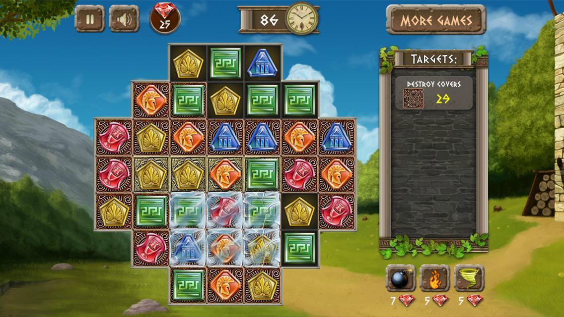 Passen Sie die alten Steine, Artefakte und Münzen an und helfen Sie, das alte Athen vor der persischen Invasion in diesem lustigen Puzzlespiel zu retten. Es gibt viele verschiedene Ebenen, jedes Level hat unterschiedliche Regeln und Ziele, verschiedene Boni und Schubs, begrenzte Zeit, gefrorene Zahlen, Ketten und andere Hindernisse. Das großartige Spiel 3 Spiele herausfordernder und süchtig machender als je zuvor! Versuchen Sie, auf jedem Level 3 Sterne hoch genug zu erzielen!