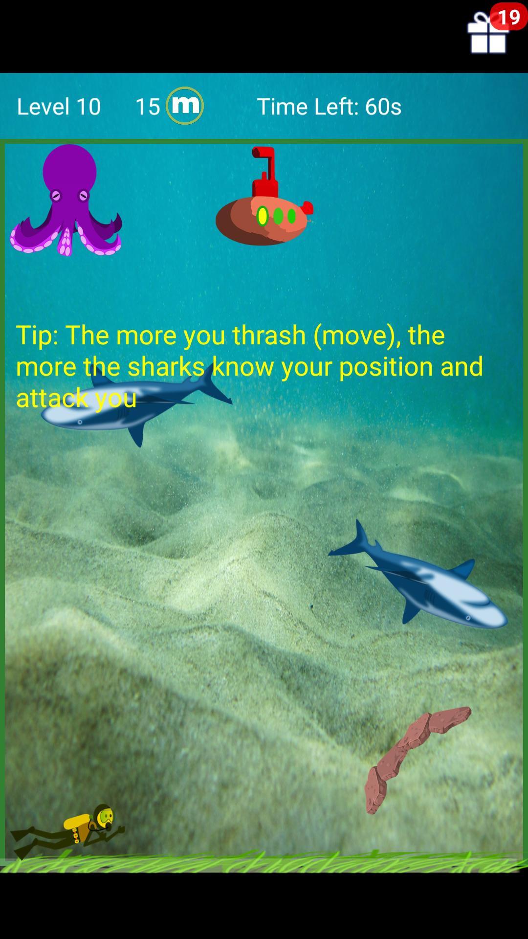 Sie sind ein Tiefsee -Taucher, der erforscht, na ja ... die tiefen See ... und plötzlich merkte Sie, dass Sie nur 60 Sekunden Sauerstoff in Ihrem Tank haben. Sie schauen in Ihr U -Boot und machen sich auf den Weg dazu. Aber es gibt nur ein Problem, das Sie sehen. Während Sie sich freuten, die Meere zu erkunden, sind einige Fishies in der nahe gelegenen Gegend gekommen und blockieren nun Ihren Weg zum U -Boot. Und oh, diese Fischer heißen ansonsten Haie !! Jetzt müssen Sie es in 60 Sekunden oder weniger in Ihr U -Boot schaffen, während Sie den hungrigen Haie vermeiden.