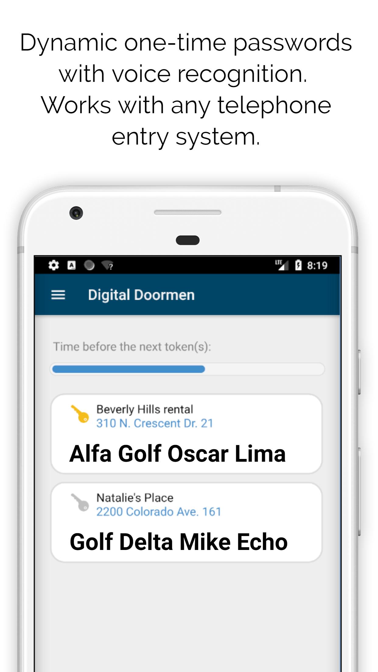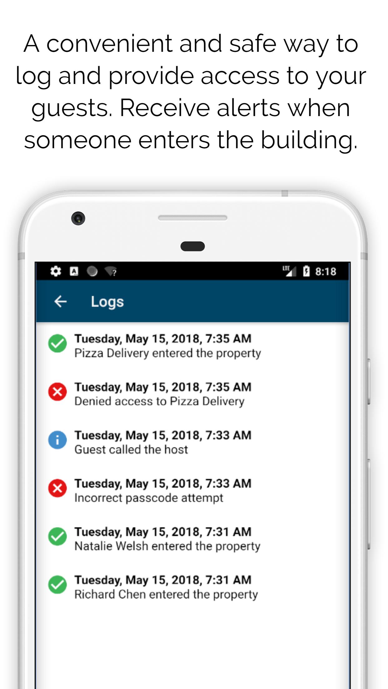 Visionarus muestra a sus visitantes, abre la puerta a sus invitados, le notifique su llegada y mantenga alejados a los alborotadores. El Digital Doorman funciona 24 por 7 y mantendrá un registro ordenado de todos sus visitantes. El acceso al edificio puede otorgarse de inmediato en cualquier momento utilizando la aplicación móvil.