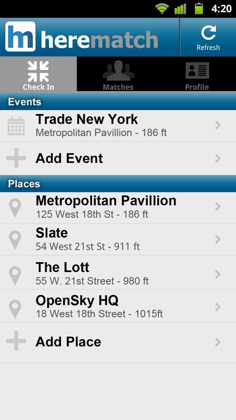Usar la aplicación es simple. Simplemente complete su perfil y consulte en lugares y eventos. herematch mostrará automáticamente una lista de personas en la habitación con las que desea hablar y que quieran hablar contigo.