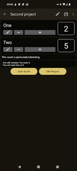 BeeCount puede almacenar múltiples proyectos de tejido de punto. Cada proyecto puede tener múltiples 'recuentos' y estos pueden aumentarse, disminuir o restablecer a cero. Los proyectos se pueden editar para agregar o eliminar recuentos después de la creación.