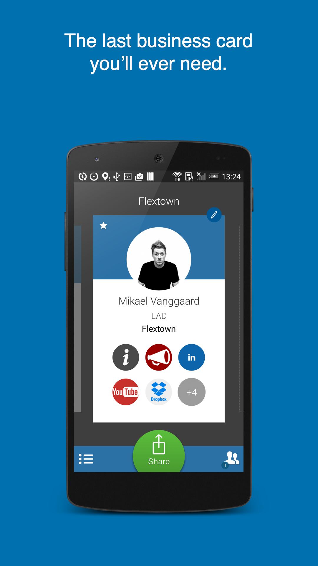 Flextown es una solución de tarjeta de negocios digital basada en la nube. Hacemos posible que usted cause una primera impresión memorable compartiendo una tarjeta de presentación digital. El destinatario no necesita una aplicación. Le ayudamos a crear clientes potenciales más valiosos recolectando automáticamente contactos en todos los que comparten una tarjeta de presentación digital. Organice contactos, escriba notas y sepa exactamente con quién ha intercambiado contactos.