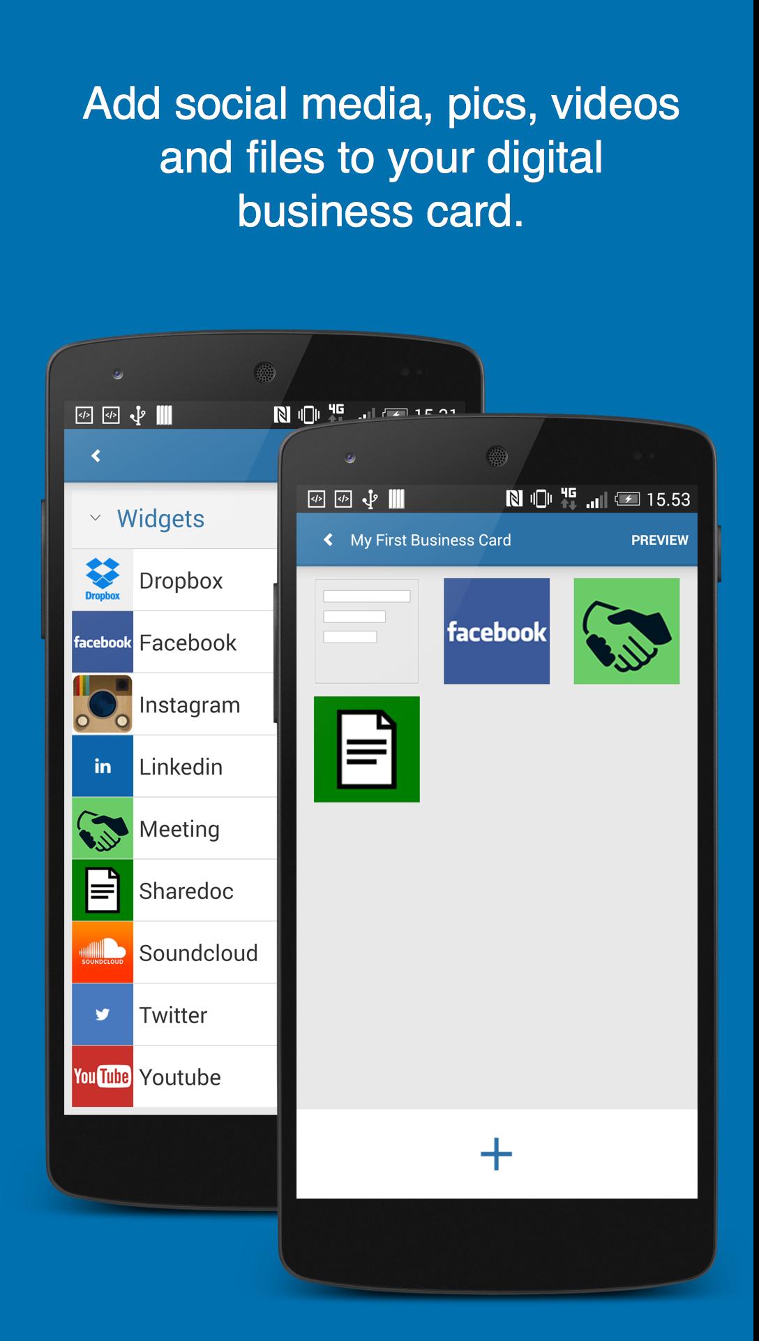 Destacar. Agregue las redes sociales, videos, pdf, fotos a su tarjeta de presentación digital y se destaque entre la multitud cuando se redacta.