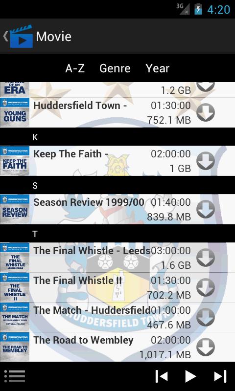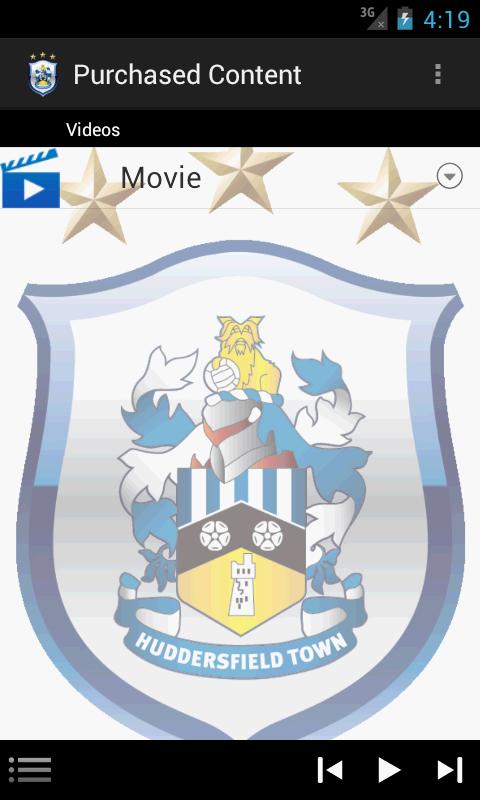 La aplicación Terrier TV . Permite a los usuarios reproducir videos redimidos en la tienda web de Huddersfield directamente en su dispositivo móvil. Descargar contenido comprado y reproducir dentro de la aplicación Terrier TV .