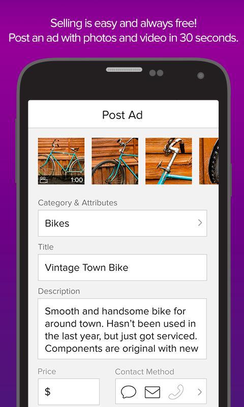• Vender sus propios artículos es fácil! Cree un anuncio con fotos y/o video en 30 segundos.